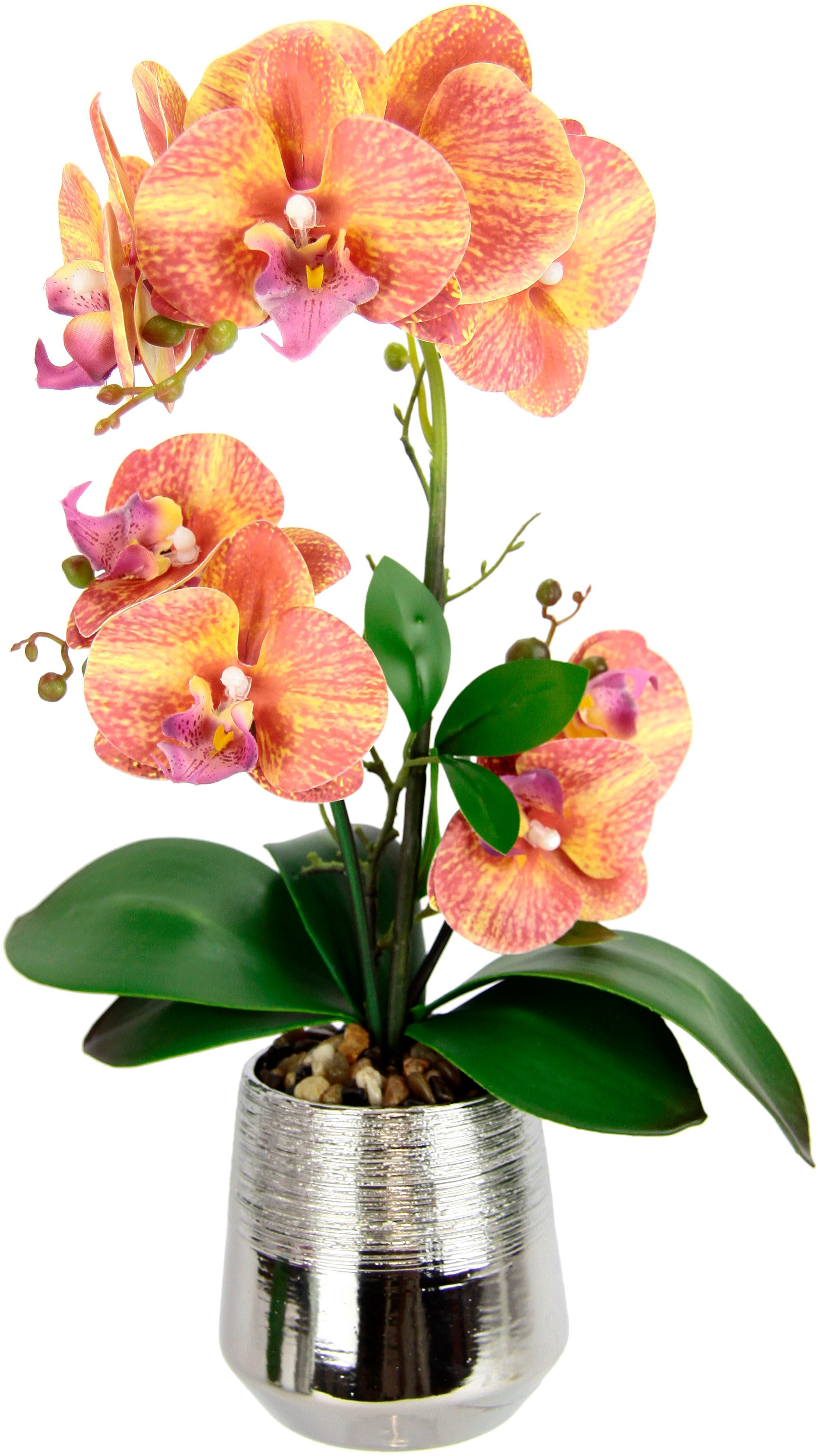 Diese kunstvolle Phalaenopsis-Orchidee in weiß mit rosa Akzenten ist eine beeindruckende Dekoration für Ihr Zuhause. Mit einer Höhe von 42 cm präsentiert sich die Kunstpflanze in einem edlen, silberfarbenen Übertopf und besticht durch ihr naturgetreues Erscheinungsbild. Die harmonische Kombination aus weißen Blüten mit zarten rosa Akzenten und sattgrünen Blättern erschafft ein lebendiges Arrangement. Die Orchidee eignet sich perfekt für die Dekoration von Wohnräumen, Büros, Schlafzimmern oder Esszimmern. Der konische Keramiktopf mit 11 cm Durchmesser bietet einen eleganten Rahmen für die verzweigten Blütenstängel. Besonders praktisch: Die Kunstblume benötigt keinerlei Pflege und behält ihre Schönheit zu jeder Jahreszeit. Die hochwertige Verarbeitung der Materialien garantiert ein dauerhaft ansprechendes Erscheinungsbild. Mit ihren realistischen Details ist diese Orchidee eine zeitlose Bereicherung für jeden Raum und eignet sich auch hervorragend als dekoratives Element bei besonderen Anlässen.