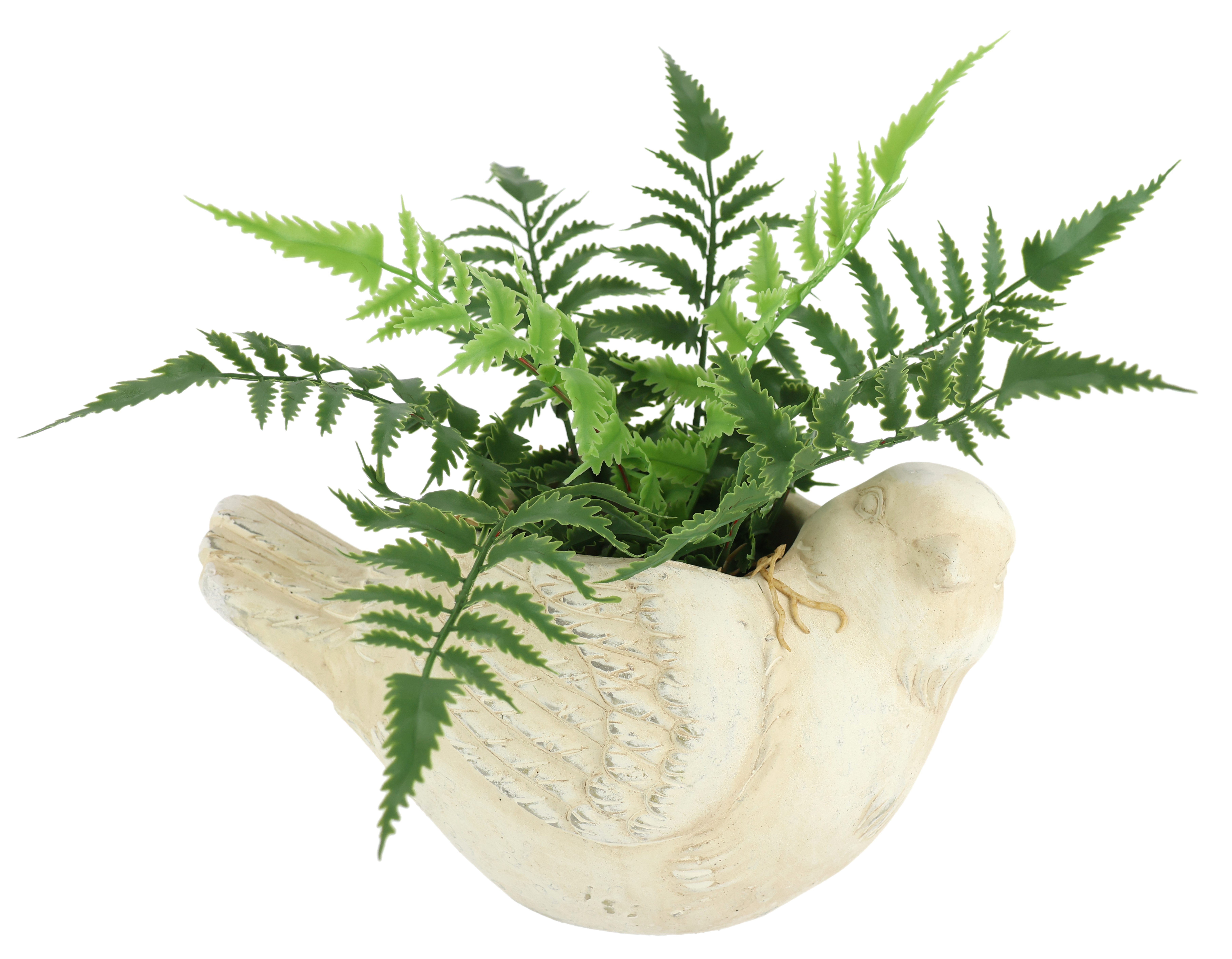Dekorative Vogel-Pflanzschale aus Zement mit künstlichem Farnbusch
