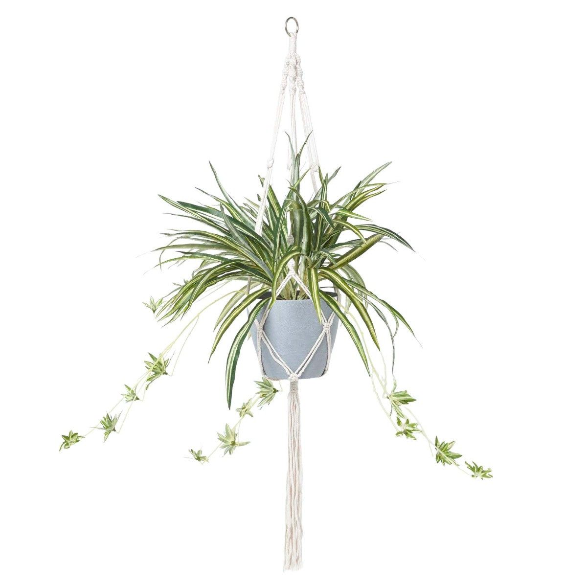 Beeindruckend realistische künstliche Grünlilie in einem grauen Hänge-Topf im Makramee-Stil mit Metallring zum Aufhängen, insgesamt etwa 95 cm groß.