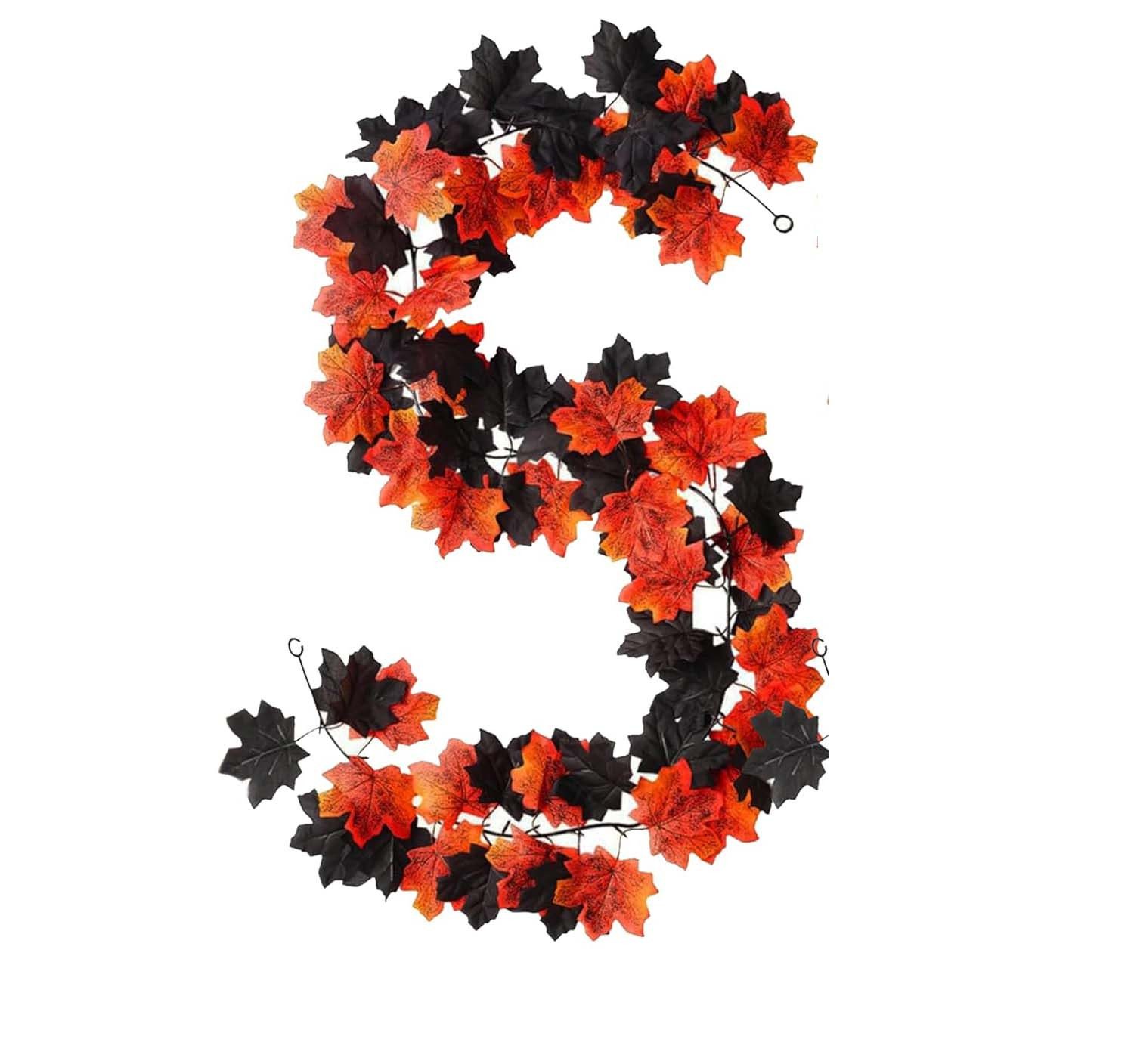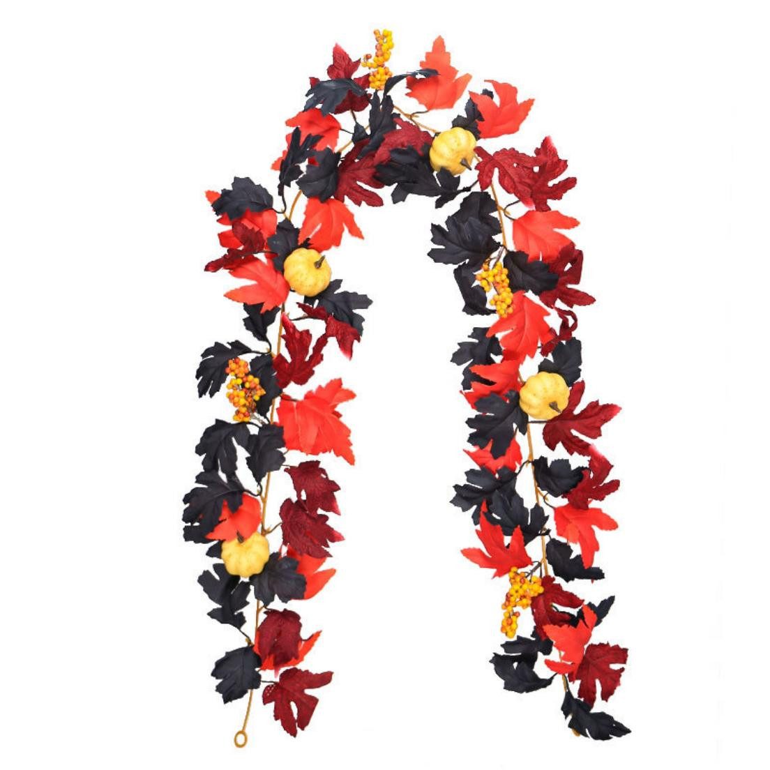 Realistische Herbstblatt-Ranke Die Ahornblätter dieser Ranke reichen in der Farbe von dunkelgrün bis leuchtendem Orange, wodurch ein realistisches Aussehen entsteht, das echten gefallenen Blättern ähnelt. Die Mischung aus verschiedenen Farben verleiht jedem Raum Wärme und Charme. Perfekt für Innen- und Außenfeiertagsdekorationen.