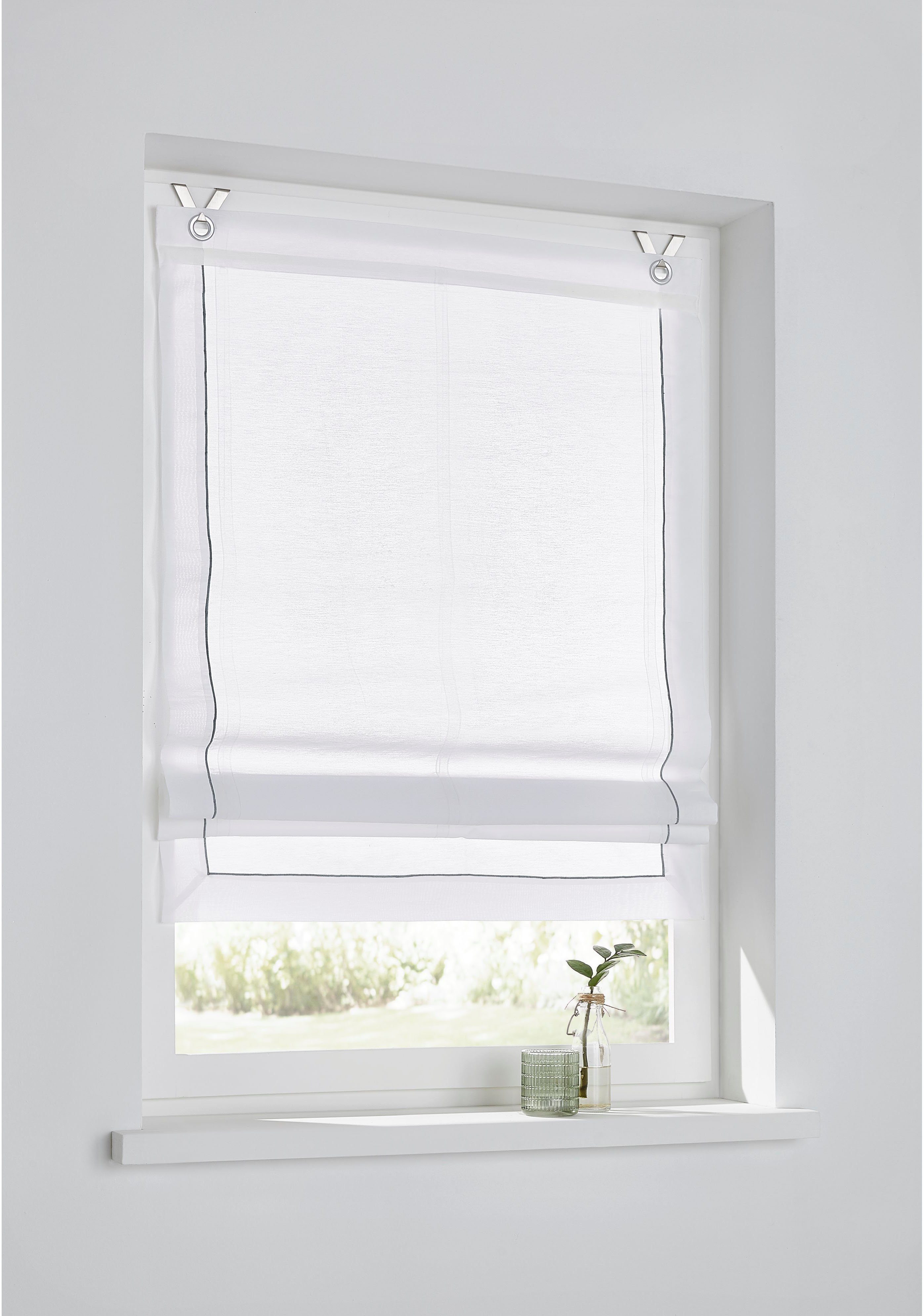 Hinweis Aufhängung | Die mitgelieferten Haken werden in den Fensterrahmen eingehängt und das Rollo an den dekorativen Ösen einfach eingehakt. Geeignet für Fensterflügelstärke zwischen 13 mm und 22 mm. |