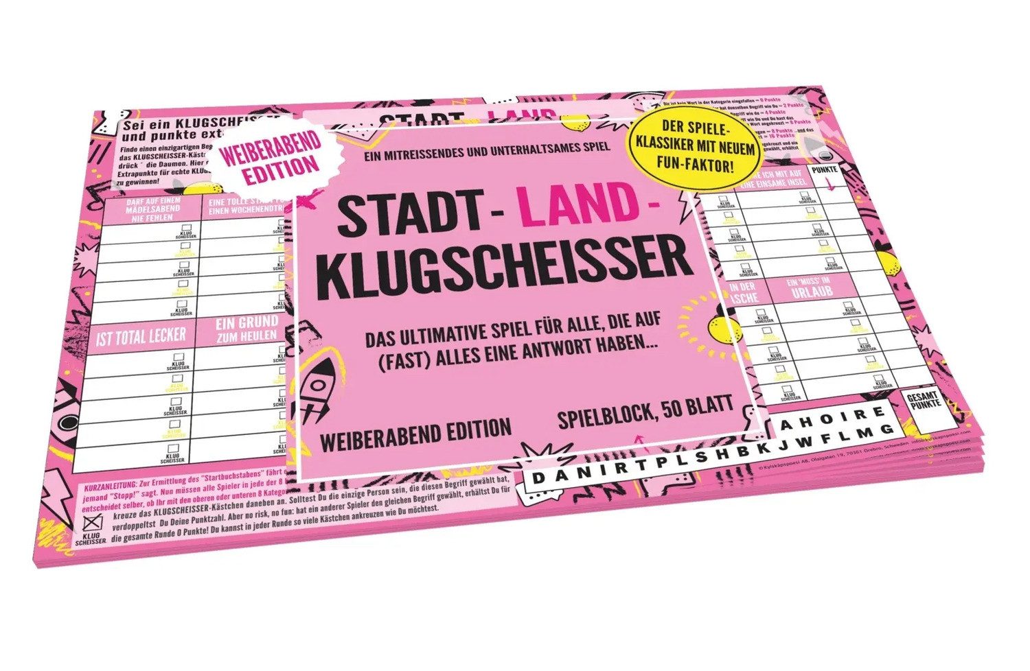 Fällt Dir eine tolle Stadt für einen Wochenendtrip mit A ein? Oder ein Promi, den Du sofort heiraten würdest, mit S? Findest Du einen einzigartigen Begriff auf den niemand anderes kommt? Mach Dich bereit für ein unvergessliches Spielerlebnis! STADT, LAND, KLUGSCHEISSER ist eine tolle und mitreißende Version des Klassikers Stadt, Land, Fluss. Ein echter Stimmungsmacher mit sehr hohem Fun-Faktor! In jede der Категории muss ein Wort eingetragen werden, das mit einem bestimmten Buchstaben beginnt. Doch darüber hinaus hast Du die Möglichkeit Deine Punkte zu verdoppeln, wenn Du einen einzigartigen Begriff notierst, von dem Du glaubst, dieser sei niemand anderem eingefallen. In diesem Fall einfach das KLUGSCHEISSER-Kästchen neben dem Wort ankreuzen, Daumen drücken und Punkte verdoppeln! Aber no risk, no fun: Sollte hier doch jemand den gleichen Begriff gewählt haben, erhält der KLUGSCHEISSER für die Runde 0 Punkte. Ein kurzweiliges Spiel mit hohem Tempo und dem Extra-Kick! Ein tolles Geschenk und das perfekte Mitbringsel für jede Gelegenheit, lustige Partys und tolle Spieleabende.