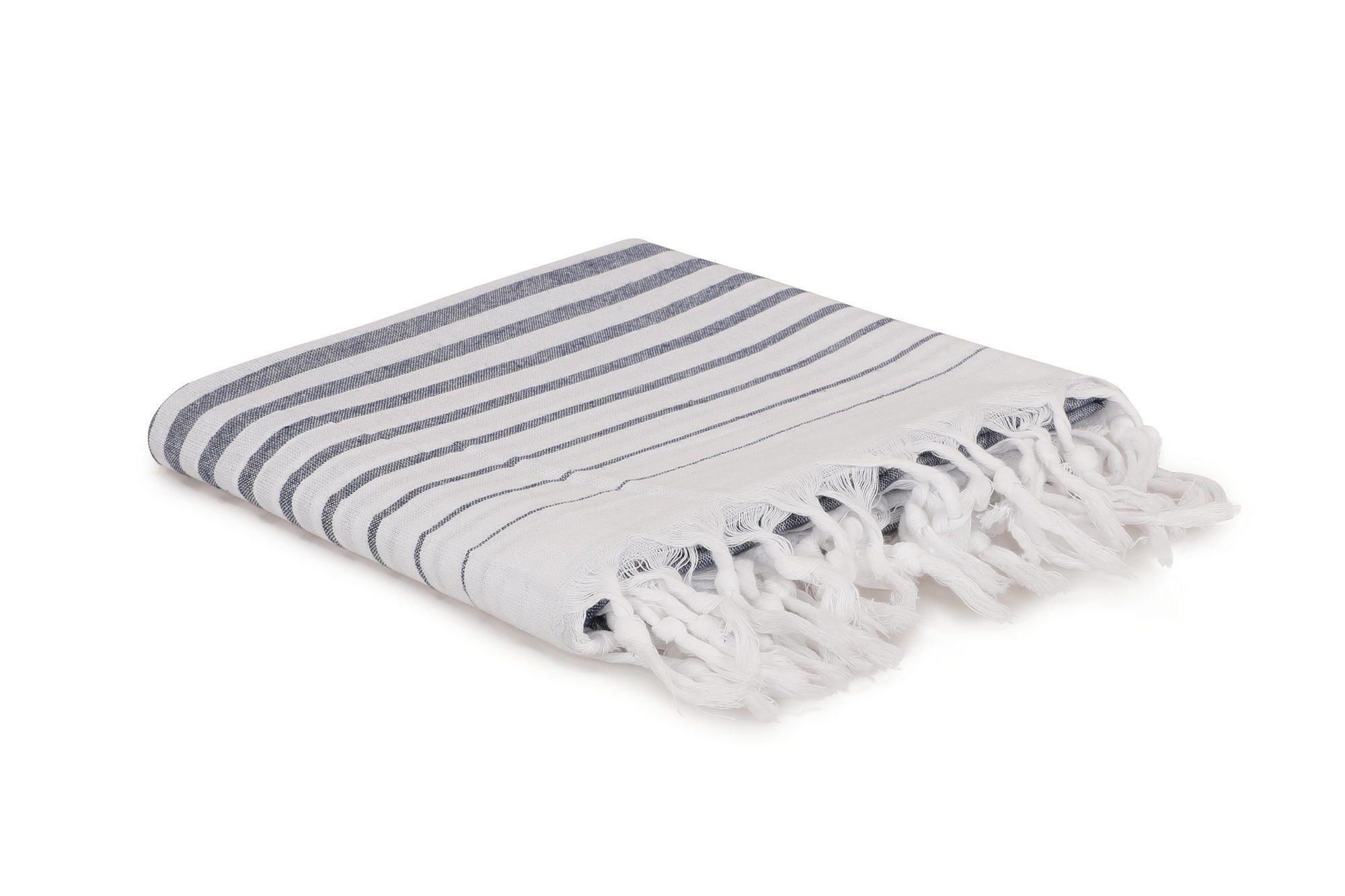 Verleihen Sie Ihrem Strandstil einen Hauch von Eleganz mit unserem dunkelblauen Fouta Strandtuch.