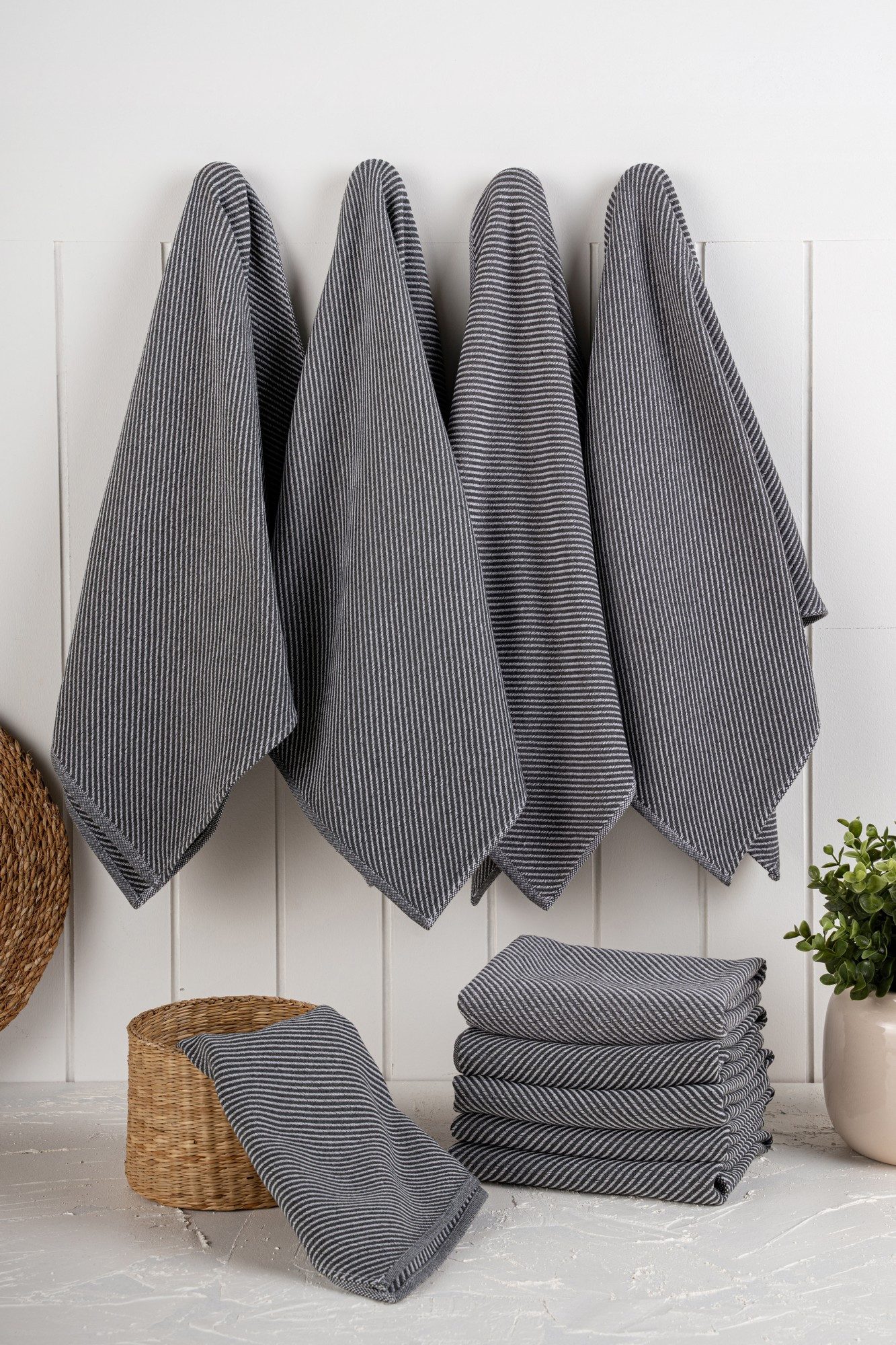 Mit ihrer eleganten Anthrazitfarbe verleihen diese Handtücher Ihrer Kücheneinrichtung einen Hauch von Eleganz. Das klassische Design ist perfekt für jede Art von Küche, von modern bis traditionell.