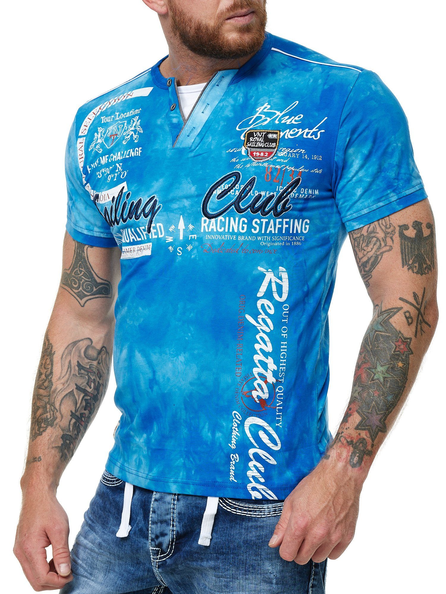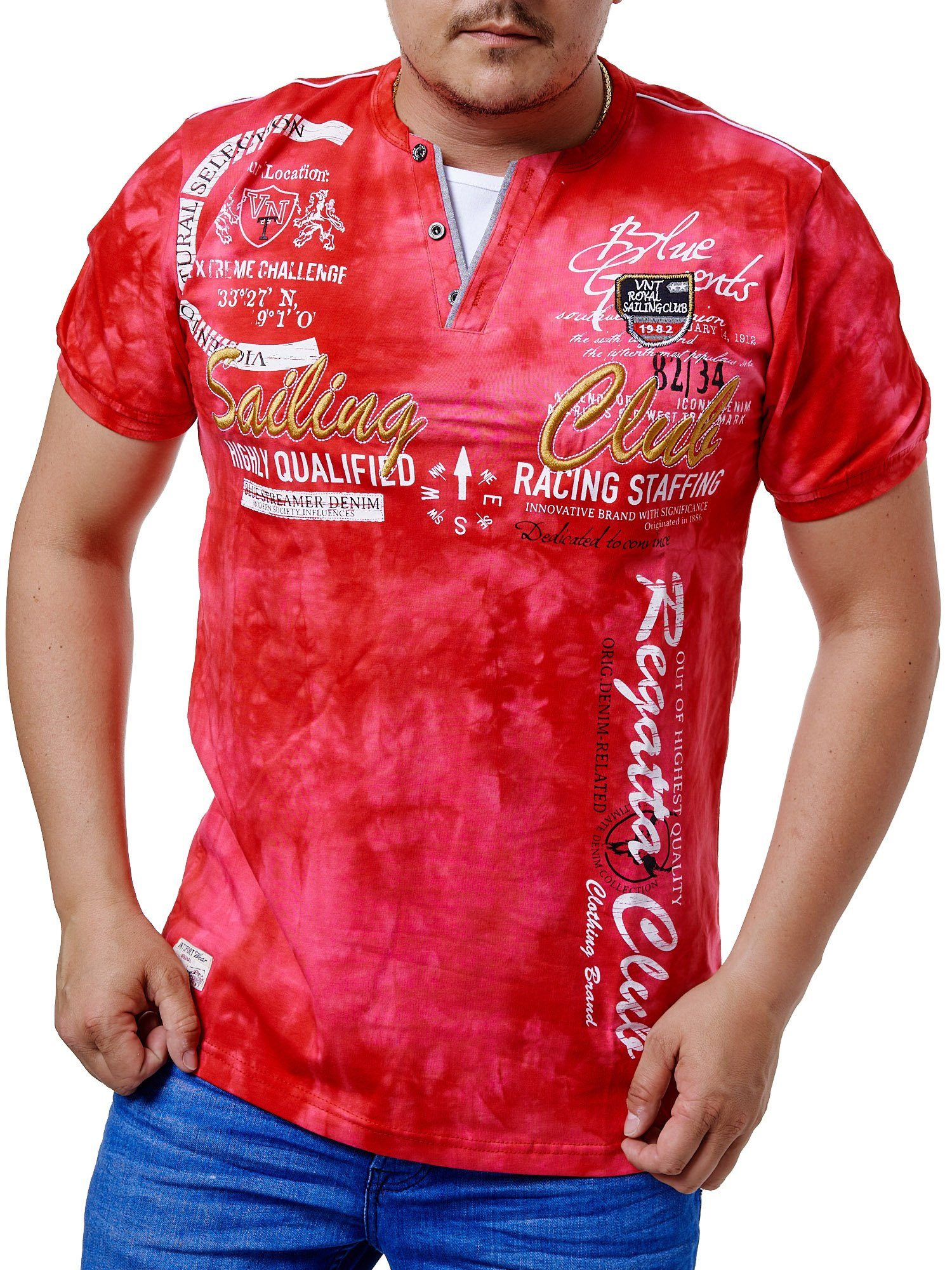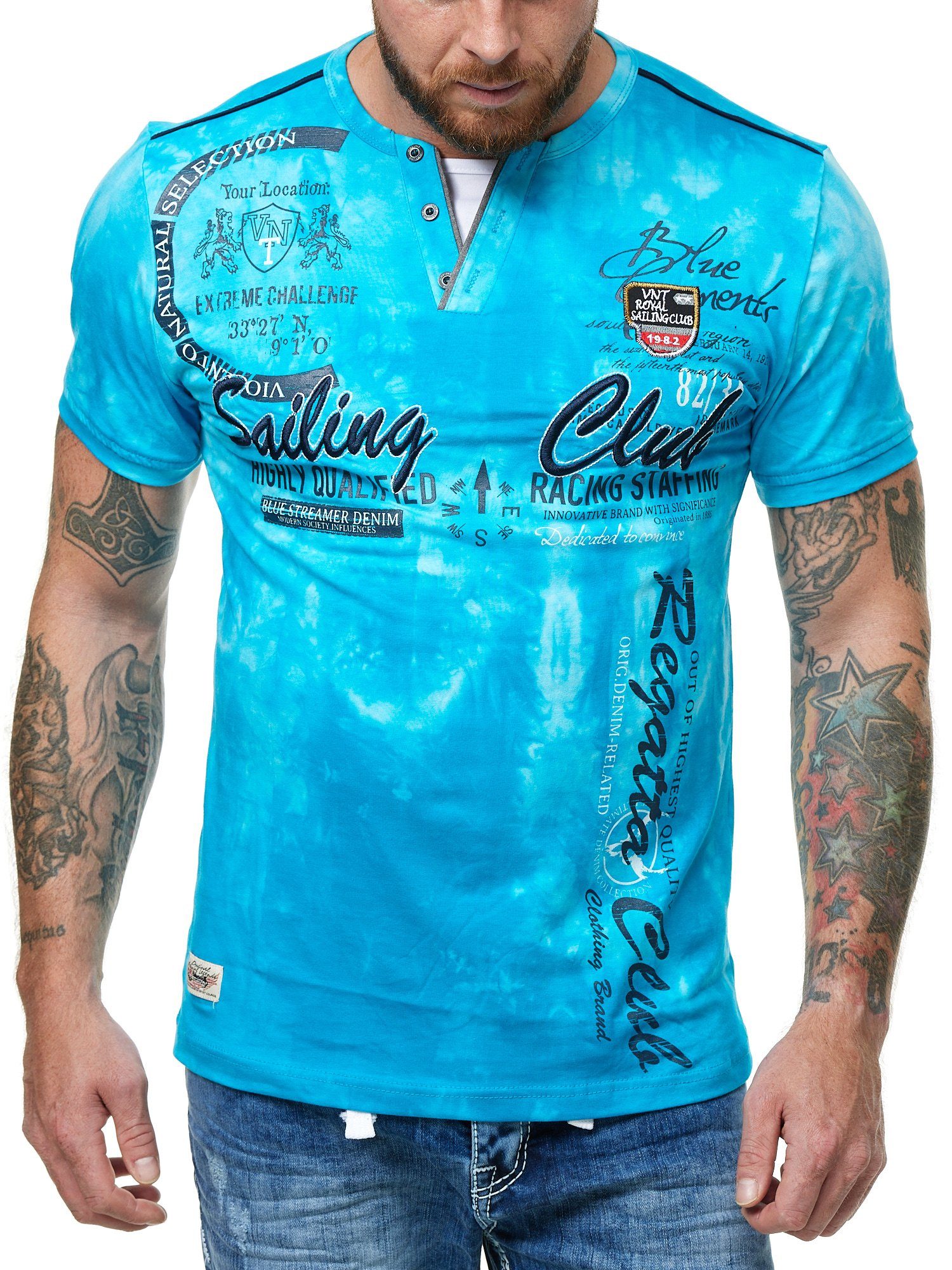 Unsere T Shirts zeichnen sich nicht nur durch die farblich abgesetzte Knopfleiste im V Ausschnitt aus, sondern auch durch den angesagten Batik-Look. Hier treffen auserwählte Farben in einem Farbbad auf die hochwertige Baumwolle und mittels eines Reserveverfahrens entstehen einzigartige Batik-Muster! Das Sailing Club Motiv ist in schönen großen Buchstaben gestickt und zeichnet sich durch strahlende Farben aus.