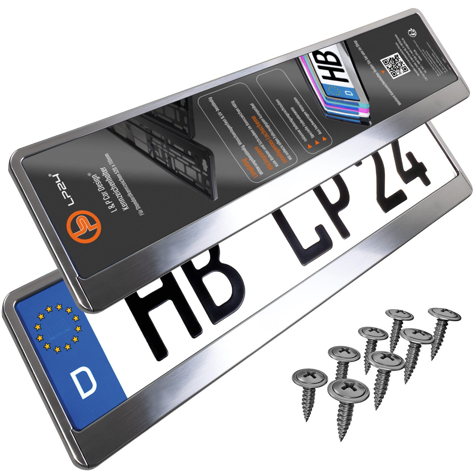 Bei uns erhalten Sie 2 Stück ( 1 Paar Vorne + Hinten) Kennzeichenhalter in Chrom-gebürsteter Optik.