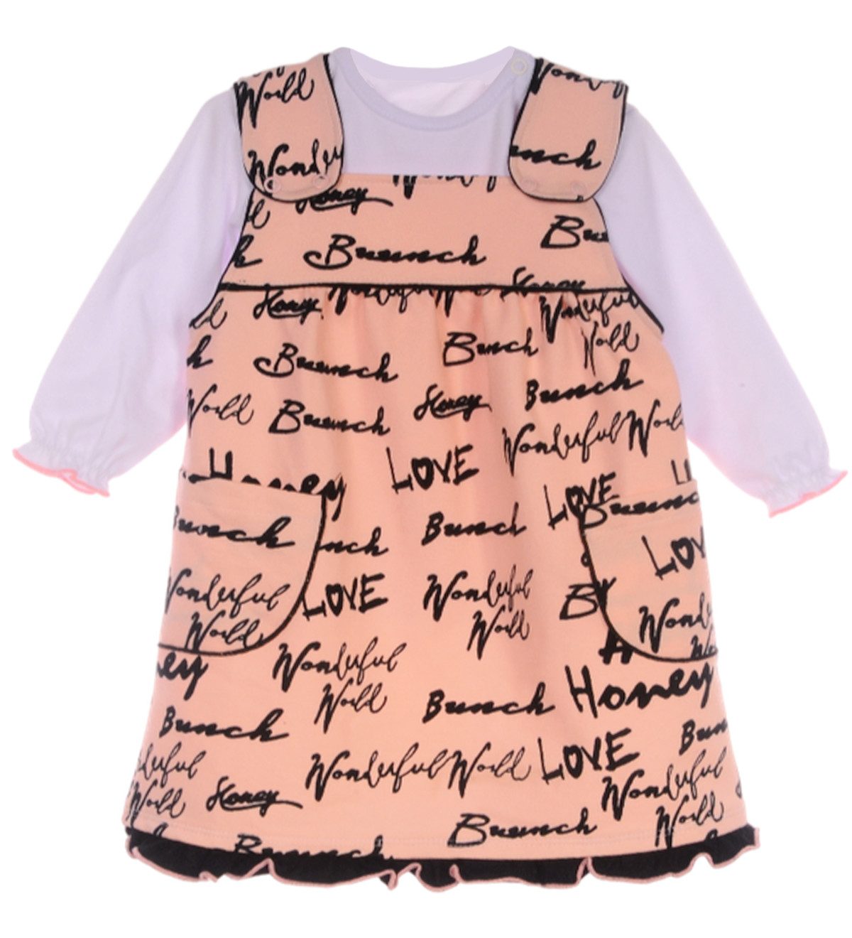 Festliches Design: 2-teiliges Set mit einem Kleid in Lachstönen und schwarzen Schriftzügen sowie einem weißen Langarmshirt.