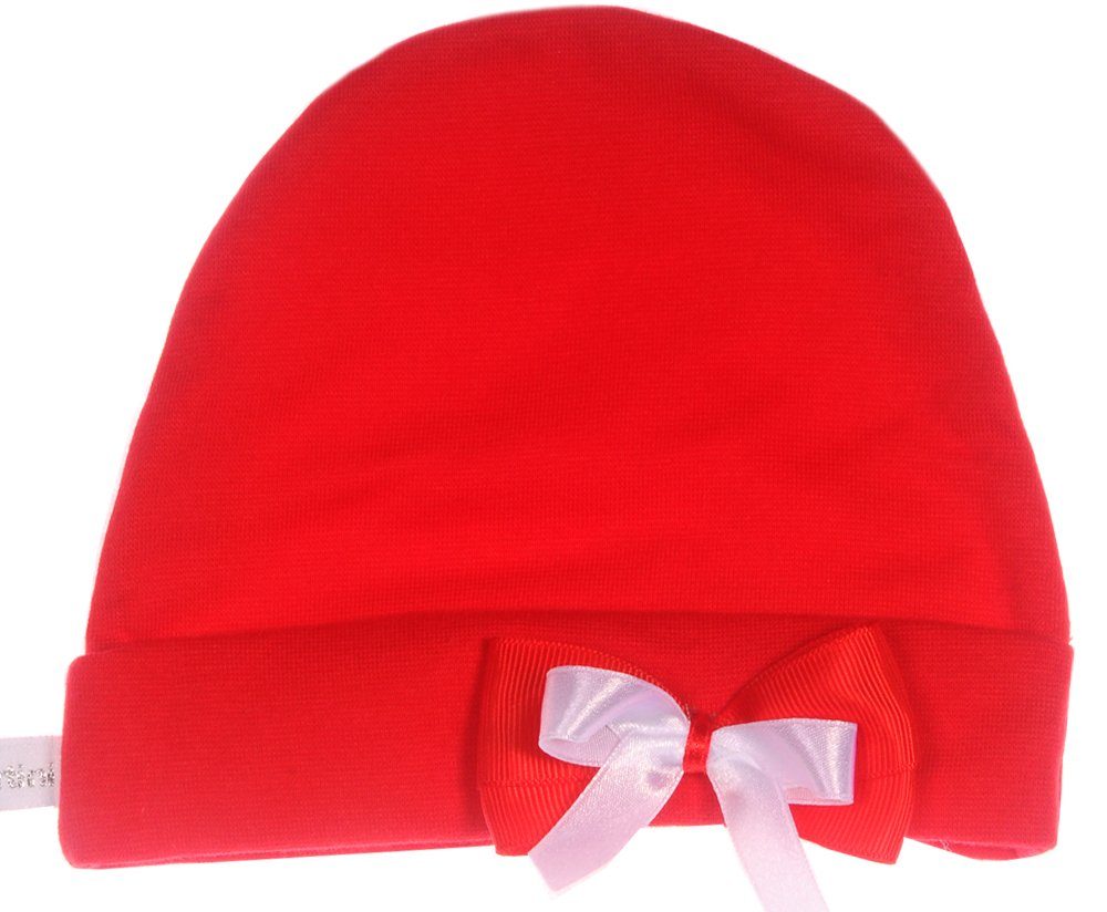 Eine stilvolle Babymütze in Rot, verziert mit einer süßen Schleife auf der Vorderseite. Die Mütze besteht aus einer weichen Mischung aus Baumwolle und Elasthan, die für eine angenehme Passform und optimalen Tragekomfort sorgt. Das ungefütterte Design ist leicht und atmungsaktiv, ideal für den Alltag oder besondere Anlässe, bei denen das Baby besonders hübsch aussehen soll. Ein niedliches Accessoire, das jedem Outfit eine charmante Note verleiht. Größen: Frühchen 44-50 (KU 32-34cm), 0-1Mon 50-56 (KU 34-36cm), 1-3Mon 56-62 (KU 36-38cm), 62-68 (KU 38-40cm), 68-74 (KU 40-42cm), 74-80 (KU 42-44cm), 80-86 (KU 44-46cm), 86-92 (KU 46-48cm), 92-98 (KU 48-50cm) oder 98-104 (KU 50-54cm) nach Wahl. KU = Kopfumfang