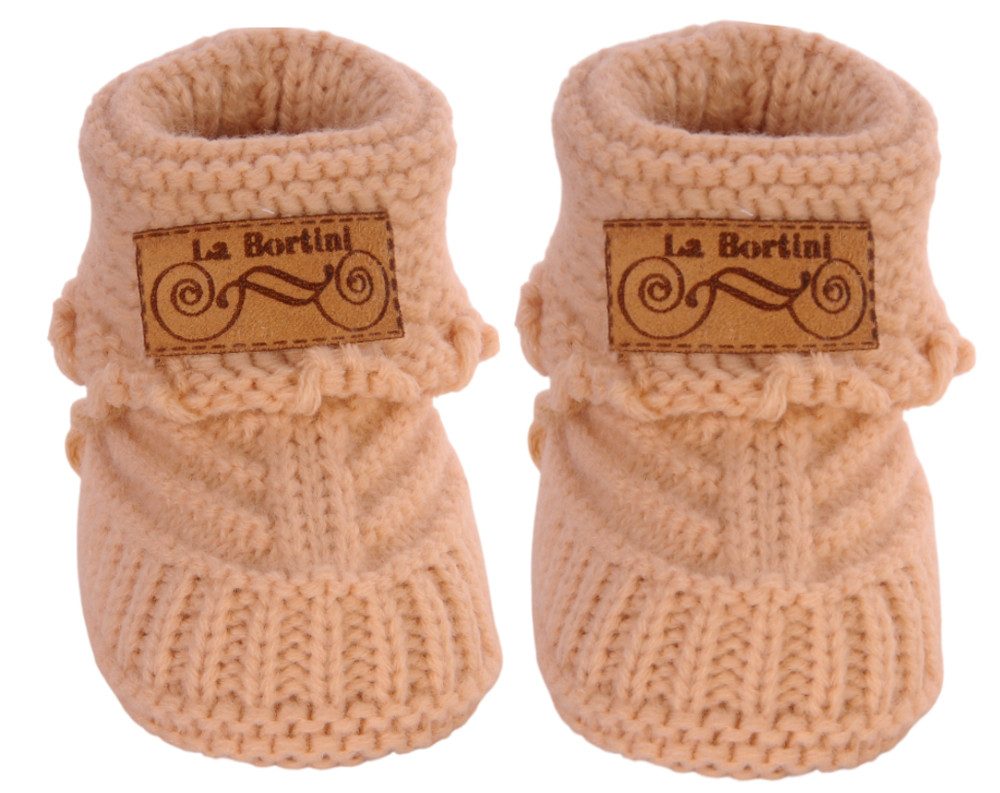 Diese hübschen Baby Strickschuhe in sanftem Beige sind perfekt für Neugeborene von 0 bis 6 Monaten. Hergestellt aus weichem 100% Polyacryl, sorgen sie für ein angenehmes Tragegefühl und halten kleine Füßchen wohlig warm. Der elegante La Bortini-Aufnäher verleiht den Schühchen eine besondere, hochwertige Note. Durch die elastische Passform sitzen sie sicher am Fuß, ohne zu drücken. Ob für den Alltag, festliche Anlässe oder als liebevolles Geschenk zur Geburt oder Taufe – diese stilvollen Baby Strickschuhe kombinieren Komfort, Wärme und zeitlose Eleganz.