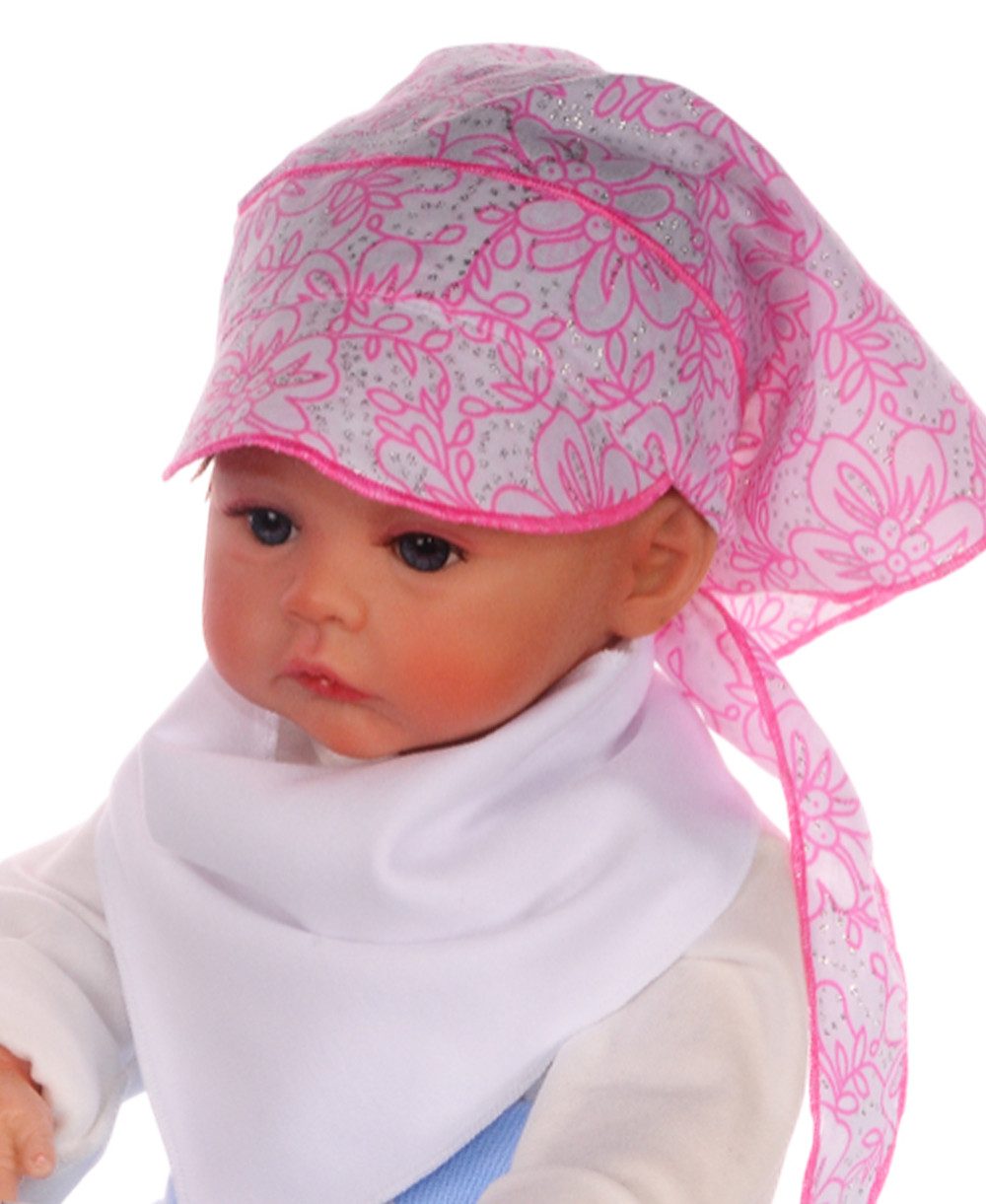 Zartes, dreieckiges Baby- und Kinder-Kopftuch in Rosa, mit verspieltem Blumenmuster und schimmerndem Lurex-Faden – perfekt für festliche Anlässe oder den Sommer-Alltag. Das Tuch ist mit langen Bindebändern versehen und lässt sich individuell anpassen – passend für einen Kopfumfang von ca. 40 bis 52 cm. Der weiche, leichte Stoff aus 80% Baumwolle und 20% Polyester ist angenehm zu tragen, atmungsaktiv und ideal für empfindliche Kinderhaut. Eine bezaubernde Kopfbedeckung für kleine Mädchen – auch als Geschenk zur Geburt oder Taufe wunderbar geeignet. Möchtest du dieselbe Beschreibung auch für andere Farben oder Muster?