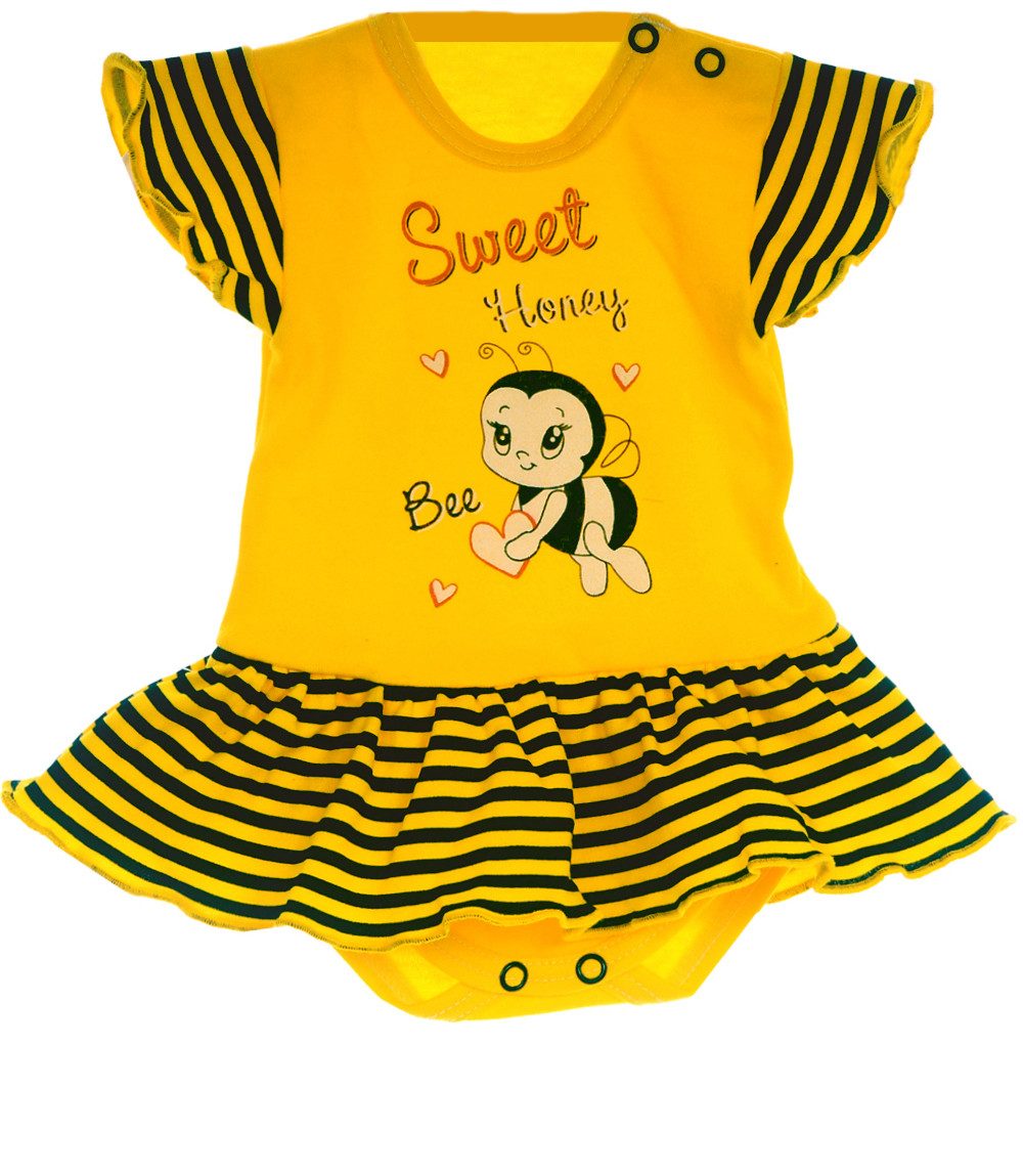 Das Baby-Bodykleidchen ist ein niedlicher Bodysuit in leuchtendem Gelb, verziert mit schwarzen Streifen an den Ärmeln und am Rocksaum, die an das Muster einer Biene erinnern. Auf der Vorderseite prangt ein süßes, kindliches Bienenmotiv zusammen mit dem Schriftzug "Sweet Honey Bee". Mit seinen kurzen Ärmeln und dem angesetzten Rockteil wirkt es wie ein kleines Kleid und bietet zugleich die Funktionalität eines Bodys. Die praktischen Druckknöpfe an den Schultern erleichtern das An- und Ausziehen. Dieses charmante Bodykleidchen ist perfekt für fröhliche Sommertage und ein ideales Geschenk für kleine Entdeckerinnen.
