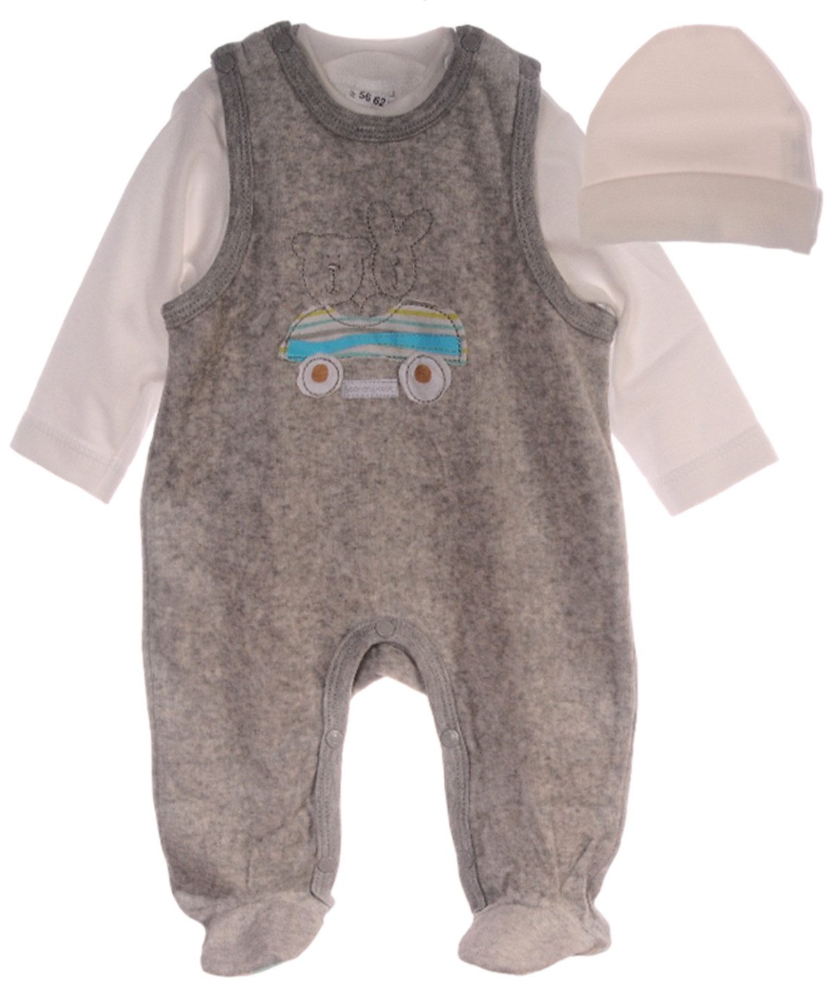 Materialien: Strampler aus Velours (grau) mit Tier-Applikation, Langarmshirt aus 100% Baumwolle, Mütze aus 95% Baumwolle und 5% Elastan