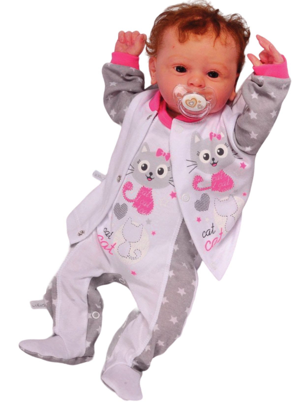 2-teiliges Babyset – Strampler & Hemdchen – Weiß-Grau-Pink mit Sternchen-Muster & Katzen-Aufdruck – aus reiner Baumwolle – für Baby Mädchen Dieses liebevoll gestaltete Babyset besteht aus einem ärmellosen Strampler mit praktischen Druckknöpfen im Schritt sowie einem passenden Hemdchen mit langen Ärmeln und seitlichen Druckknöpfen – beides in zarten Weiß-, Grau- und Pinktönen, verziert mit einem verspielten Sternchen-Muster und einem süßen Katzen-Aufdruck. Ein bezauberndes Outfit für kleine Mädchen, das Komfort und Stil ideal vereint. Der Strampler bietet dank seiner Druckknöpfe im Schritt ein einfaches Windelwechseln, während das Hemdchen sanft und ohne Ziehen über den Kopf angezogen werden kann. Die Materialien bestehen aus 100 % reiner Baumwolle – wunderbar weich, hautfreundlich und atmungsaktiv, ideal für empfindliche Babyhaut und den täglichen Gebrauch. Dieses Set eignet sich hervorragend für alle Jahreszeiten und ist eine wunderschöne Idee als Geschenk zur Geburt oder zur Erstausstattung. Produktdetails: 2-teiliges Set: Strampler (ärmellos, Druckknöpfe im Schritt) & langärmliges Hemdchen Farbe: Weiß-Grau-Pink mit Sternchen-Muster & Katzen-Aufdruck Material: 100 % Baumwolle – weich, atmungsaktiv, hautsympathisch Ideal für alle Jahreszeiten Für Baby Mädchen Perfekt als Geschenk zur Geburt