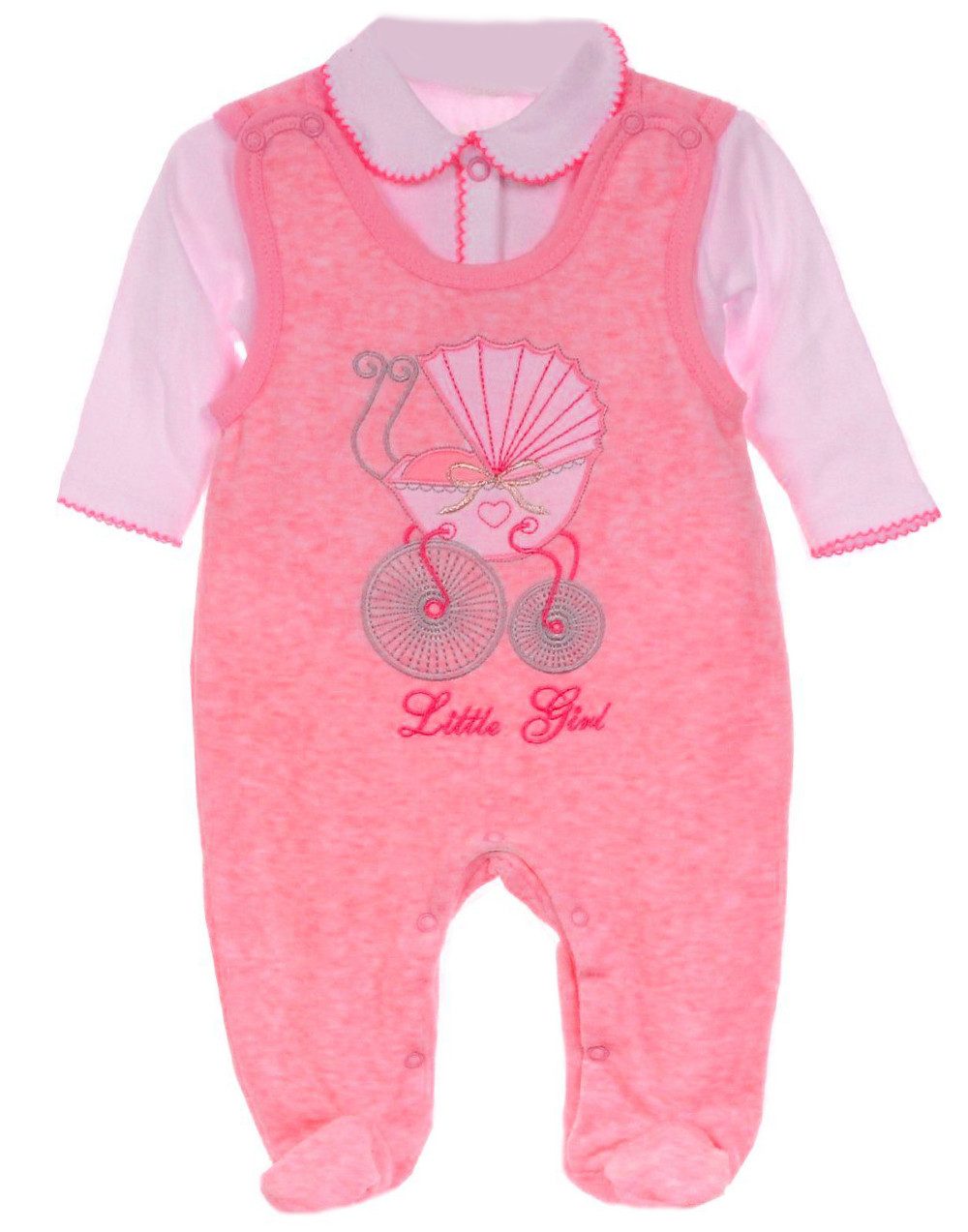 Baby Strampler-Set, 2-teilig aus Velours Dieses niedliche Set besteht aus einem weichen Velours-Strampler (80 % Baumwolle, 20 % Polyester) in Rosa mit liebevoller Kinderwagen-Stickerei sowie einem passenden weißen Hemdchen aus reiner Baumwolle mit praktischen Druckknöpfen. Der Strampler ist angenehm weich und hautfreundlich, während die Druckknöpfe das An- und Ausziehen erleichtern. Das Set ist speziell für Baby Mädchen entworfen und eignet sich ideal als Geschenk zur Geburt oder für die Baby-Erstausstattung.