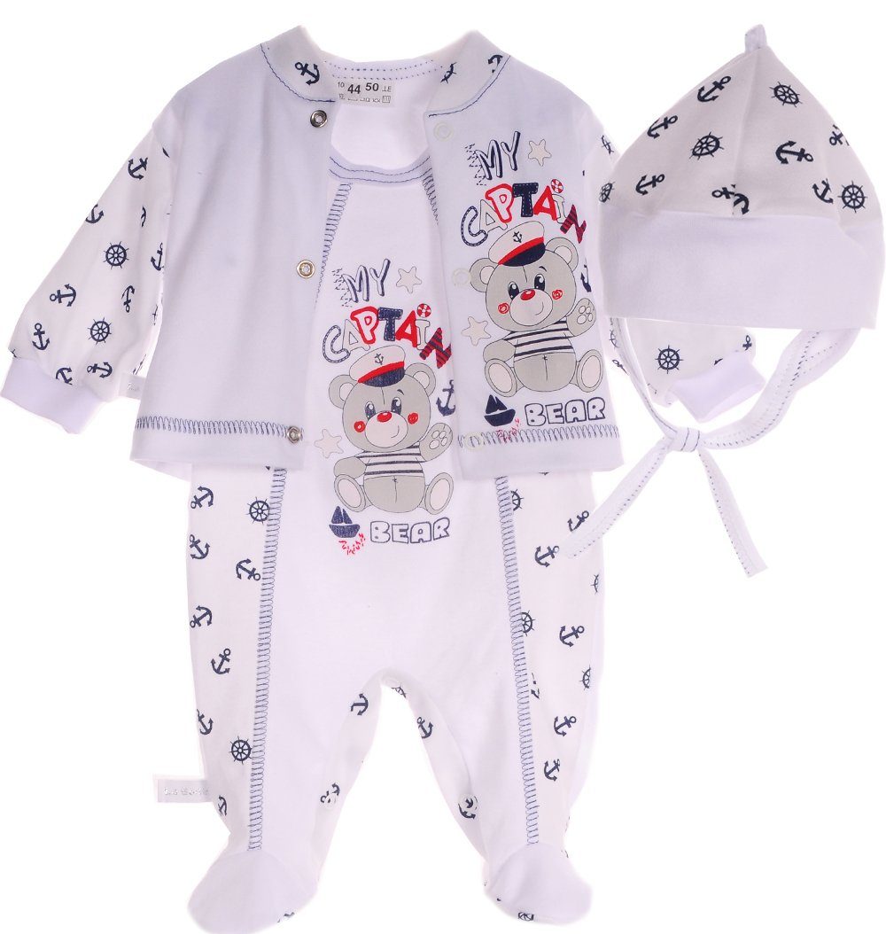 Entdecken Sie unseren 3-teiligen Babyanzug, der perfekte Begleiter für kleine Seefahrer! Dieses bezaubernde Set besteht aus einem ärmellosen Strampler, einem langen Langarmhemdchen und einer passenden Mütze, alles in einem stilvollen Weiß mit einem maritimen Anker-Muster und einem niedlichen Bärchen-Kapitän Aufdruck. Hergestellt aus hochwertiger, reiner Baumwolle bietet dieser Anzug höchsten Tragekomfort und ist sanft zur empfindlichen Babyhaut. Der Strampler ermöglicht eine bequeme Bewegung und ist ideal für alle Jahreszeiten. Kombiniert mit dem Langarmhemdchen bietet dieses Set die perfekte Lösung für wechselhaftes Wetter und sorgt dafür, dass Ihr Baby immer gut aussieht. Die niedliche Mütze schützt nicht nur vor kühlerem Wetter, sondern rundet das Outfit auch stilvoll ab. Dieser 3-teilige Babyanzug ist perfekt für besondere Anlässe oder den Alltag und eignet sich hervorragend als Geschenk für Babyshower oder zur Geburt. Statten Sie Ihre kleine Kapitänin oder Ihren kleinen Kapitän mit diesem charmanten Babyanzug aus, der sowohl modisch als auch funktional ist.