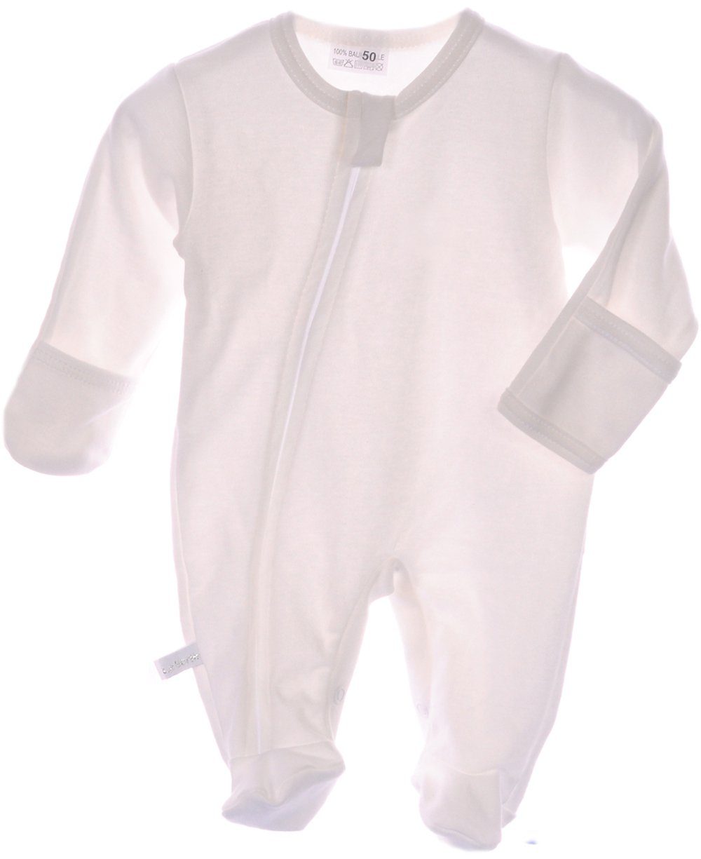 Dieser wunderschöne Baby Schlafanzug - Overall - Strampler in sanftem Creme ist aus reiner Baumwolle gefertigt und bietet ein angenehmes Tragegefühl, das die zarte Haut Ihres Babys schont. Mit seinem praktischen Reißverschluss, der über einen Kinnschutz verfügt, gestaltet sich das An- und Ausziehen mühelos. Die extra langen Ärmel sind mit einem integrierten Kratzschutz ausgestattet, der sicherstellt, dass Ihr kleiner Liebling nicht versehentlich an sich kratzt. Ideal für gemütliche Nächte und den Alltag, vereint dieser Strampler Funktionalität und ein zeitloses Design, das in jede Babygarderobe gehört.