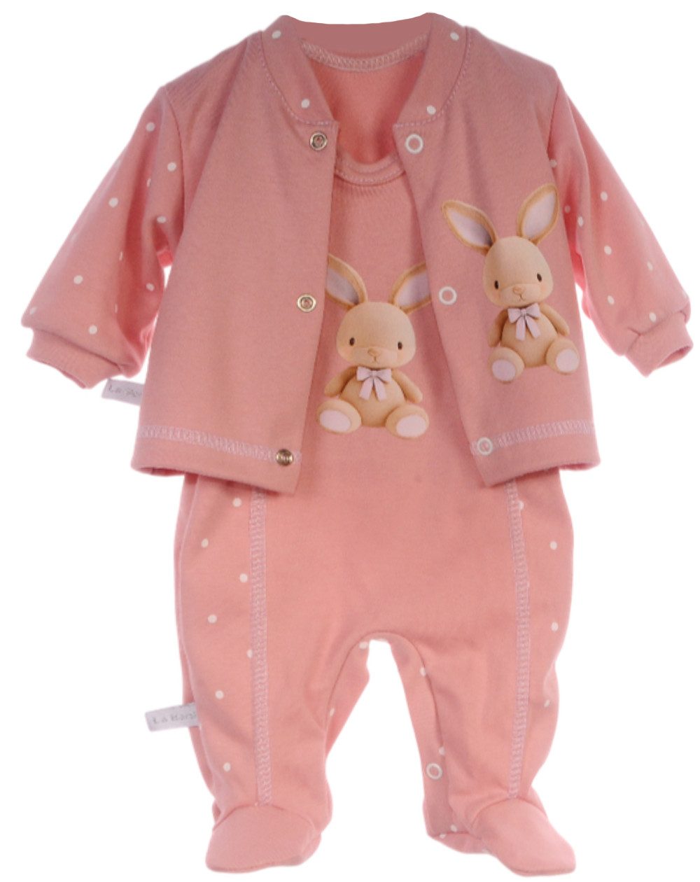 Entdecken Sie unseren zweiteiligen Baby-Anzug aus reiner Baumwolle – perfekt für zarte Babyhaut und höchsten Tragekomfort. Das Set umfasst einen kuschelweichen Strampler mit praktischen Druckknöpfen im Schritt- und Schulterbereich sowie ein passendes Hemdchen mit Druckknöpfen für einfaches An- und Ausziehen. In einem zarten Puderrosa mit niedlichem Punktemuster und liebevollem Hasenaufdruck gestaltet, ist dieses Outfit ideal für Mädchen. Dank der hochwertigen Verarbeitung und des zeitlosen Designs eignet es sich für jede Jahreszeit. Ob als Geschenk zur Geburt oder als besondere Überraschung zu Ostern – dieses Set verbindet Stil, Funktionalität und Gemütlichkeit in einem.
