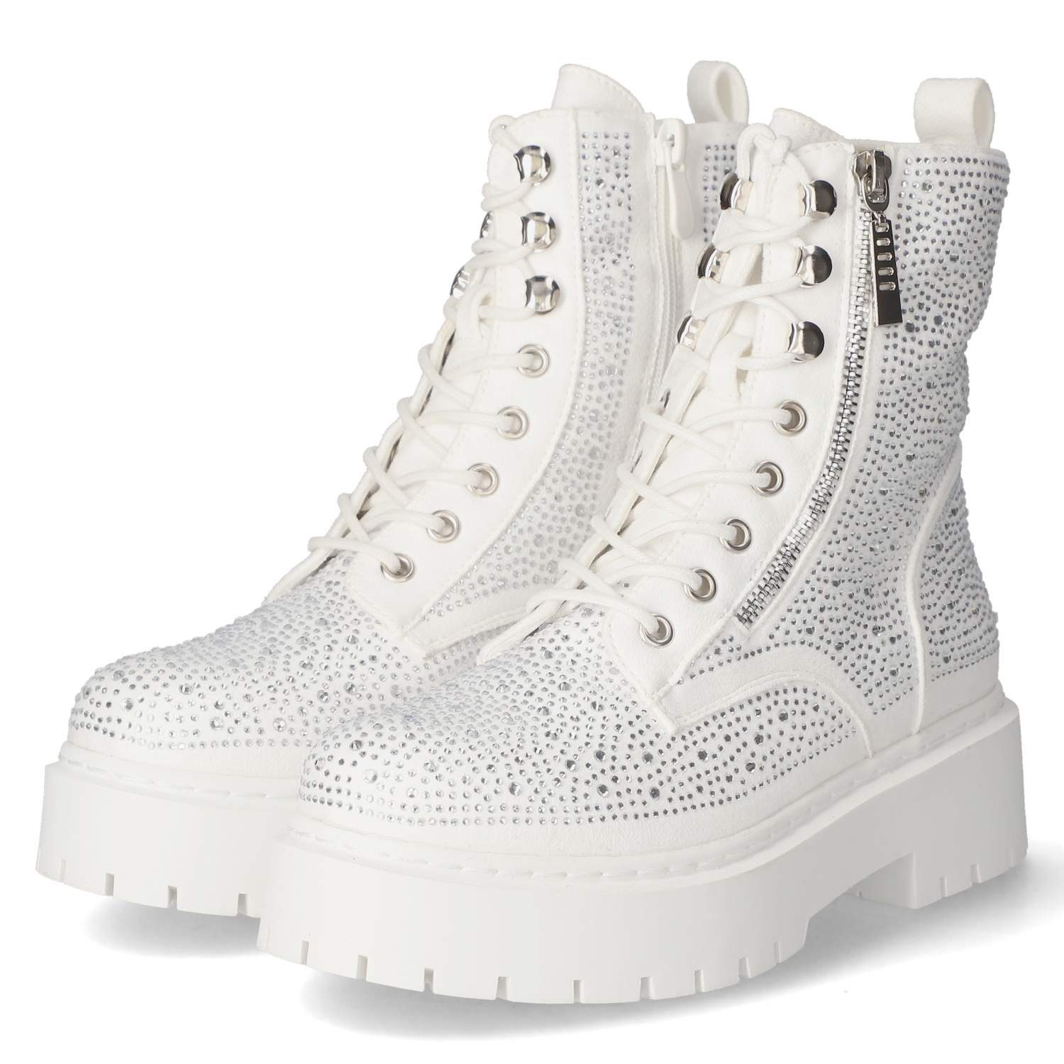 Weiße Schnürstiefeletten von La Strada verleihen Looks eine klare, moderne Note. Die elegant schimmernde Synthetik zeigt sich pflegeleicht, der 5 cm Blockabsatz bietet angenehme Höhe und sicheren Stand. Mit runder Spitze, weich gepolsterter Decksohle und leichtem Futter ist Komfort zuverlässig eingeplant. Die Schnürung erlaubt Feinanpassung, ein seitlicher Reißverschluss sorgt für Komfort beim Anziehen. Ein zusätzlicher, silberner Zierreißverschluss mit Schmucksteinen bringt subtile Strahlkraft. Verstärkte Ferse, Anziehlasche und rutschfeste Laufsohle unterstützen den Alltagseinsatz. Die Passform fällt normal aus. Modetipp: Ton-in-Ton zu Strickkleid in Ecru und wattierter Weste entsteht ein cleaner Winterlook mit moderner Texturvielfalt.