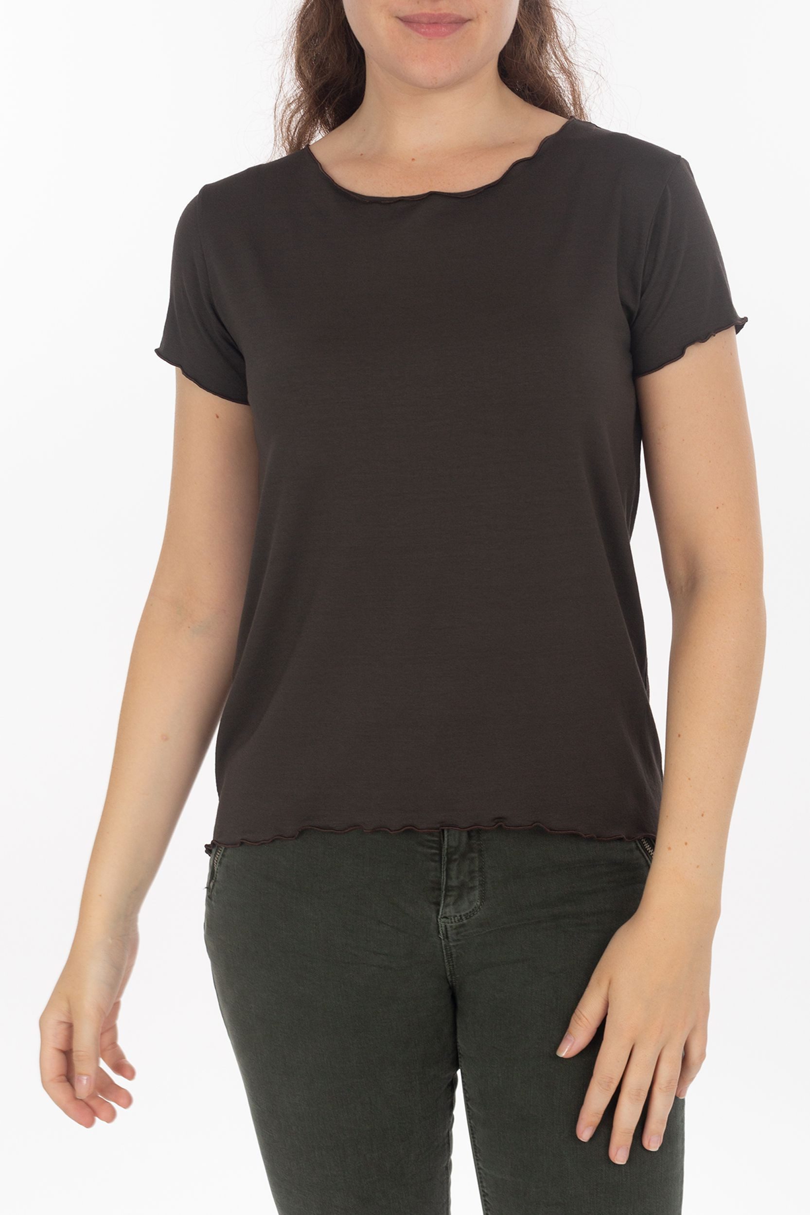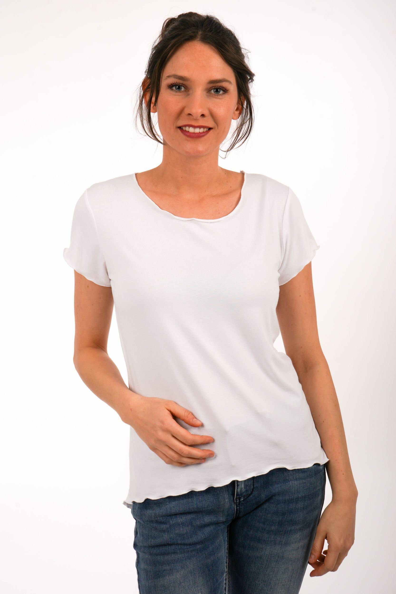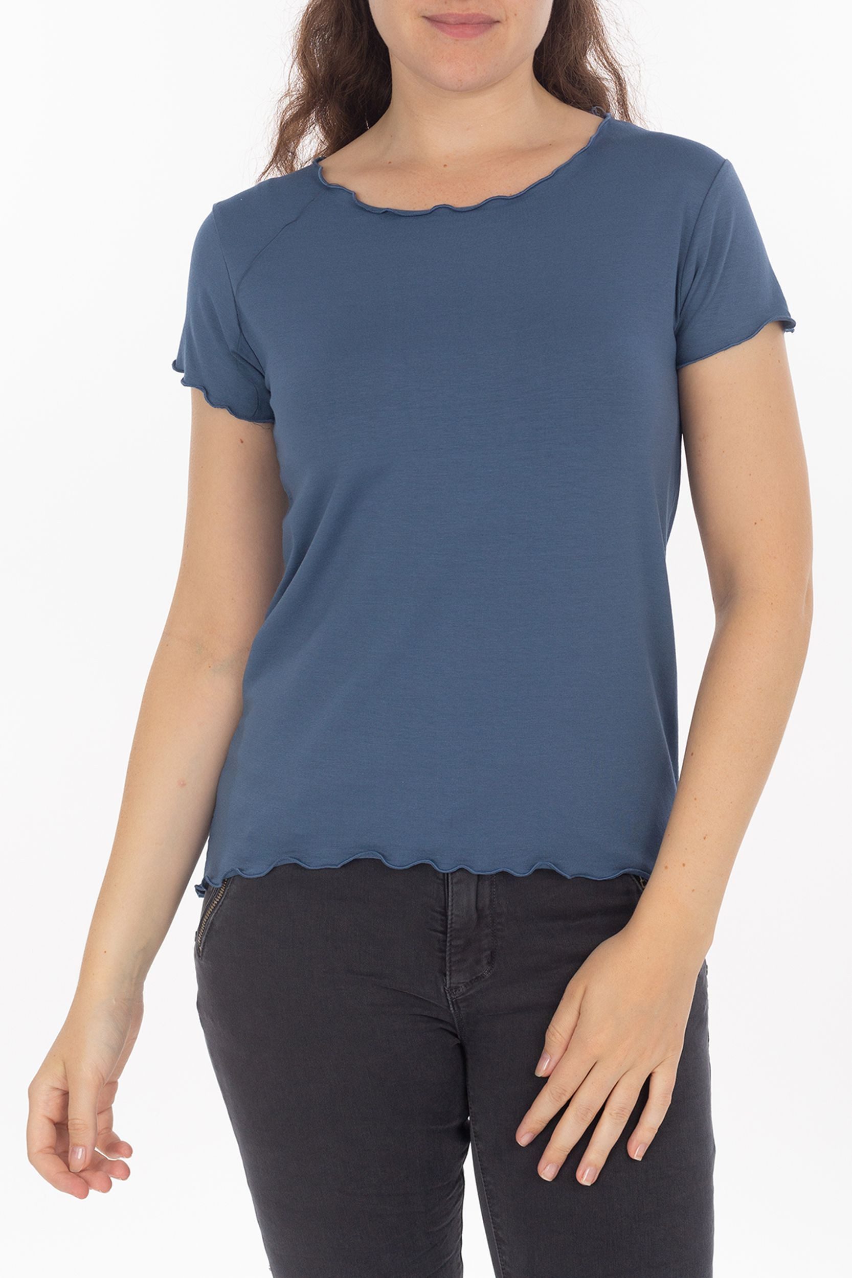 Dieses Basic T-Shirt darf auf keinen Fall in Ihrem Kleiderschrank fehlen! Es hat unten und an den Ärmeln einen Wellensaum und kann als Grundlage für diverse Outfits getragen werden. Kombinieren Sie es mit einer Jeans, einem Rock oder einer Bundfaltenhose und tragen Sie es unter Cardigans, Jeansjacken oder Blazern, die Möglichkeiten sind unendlich!
