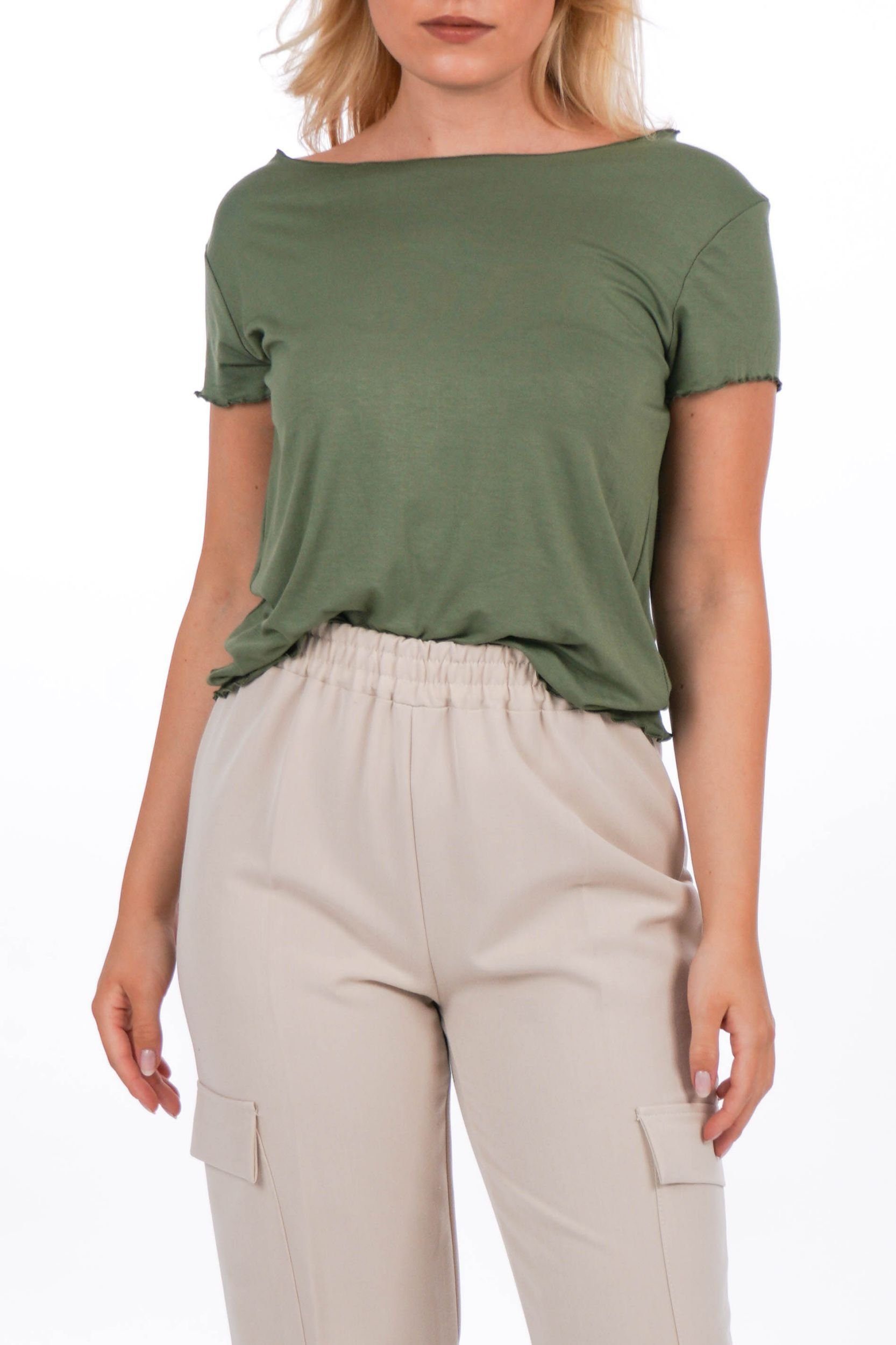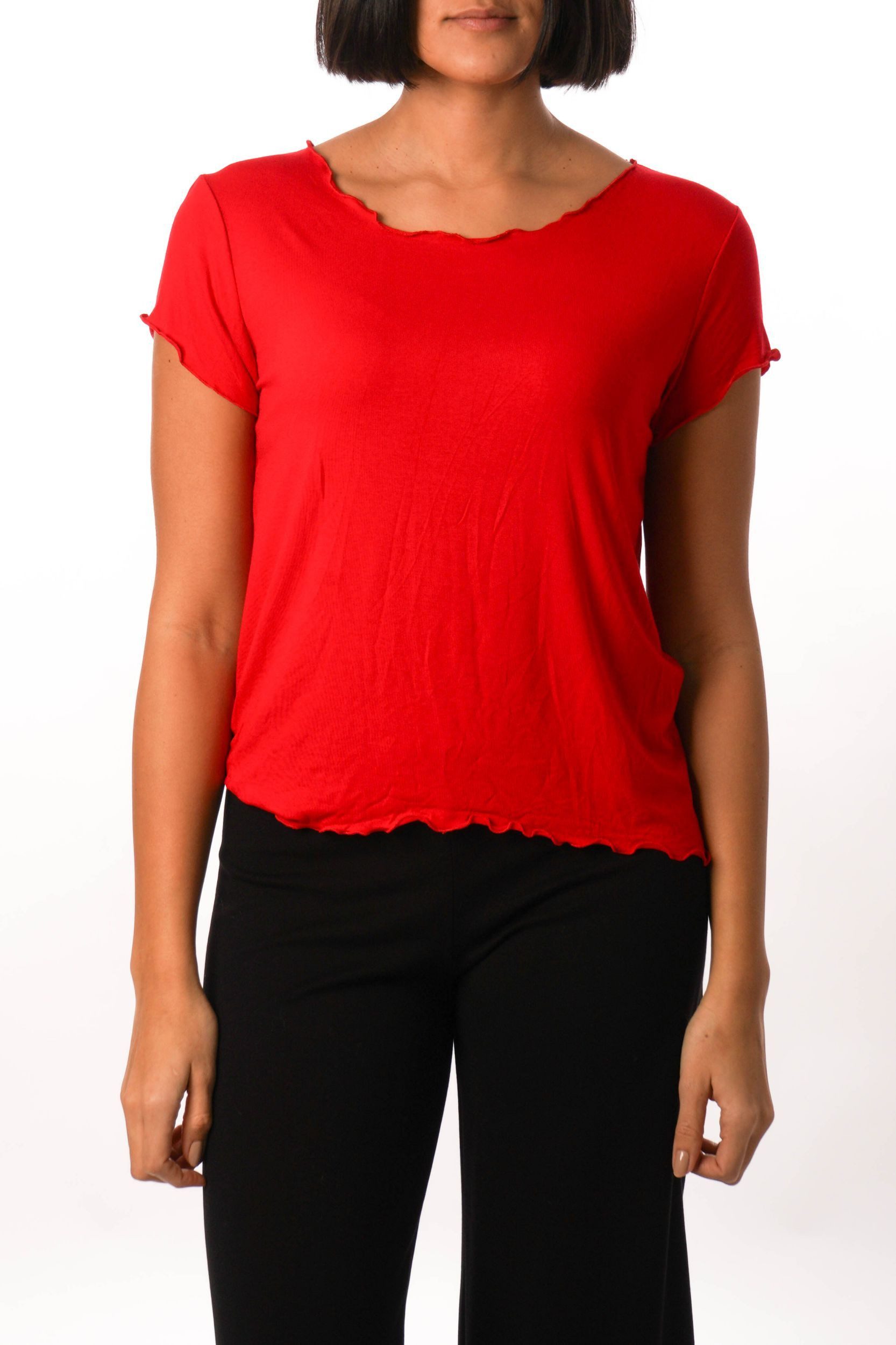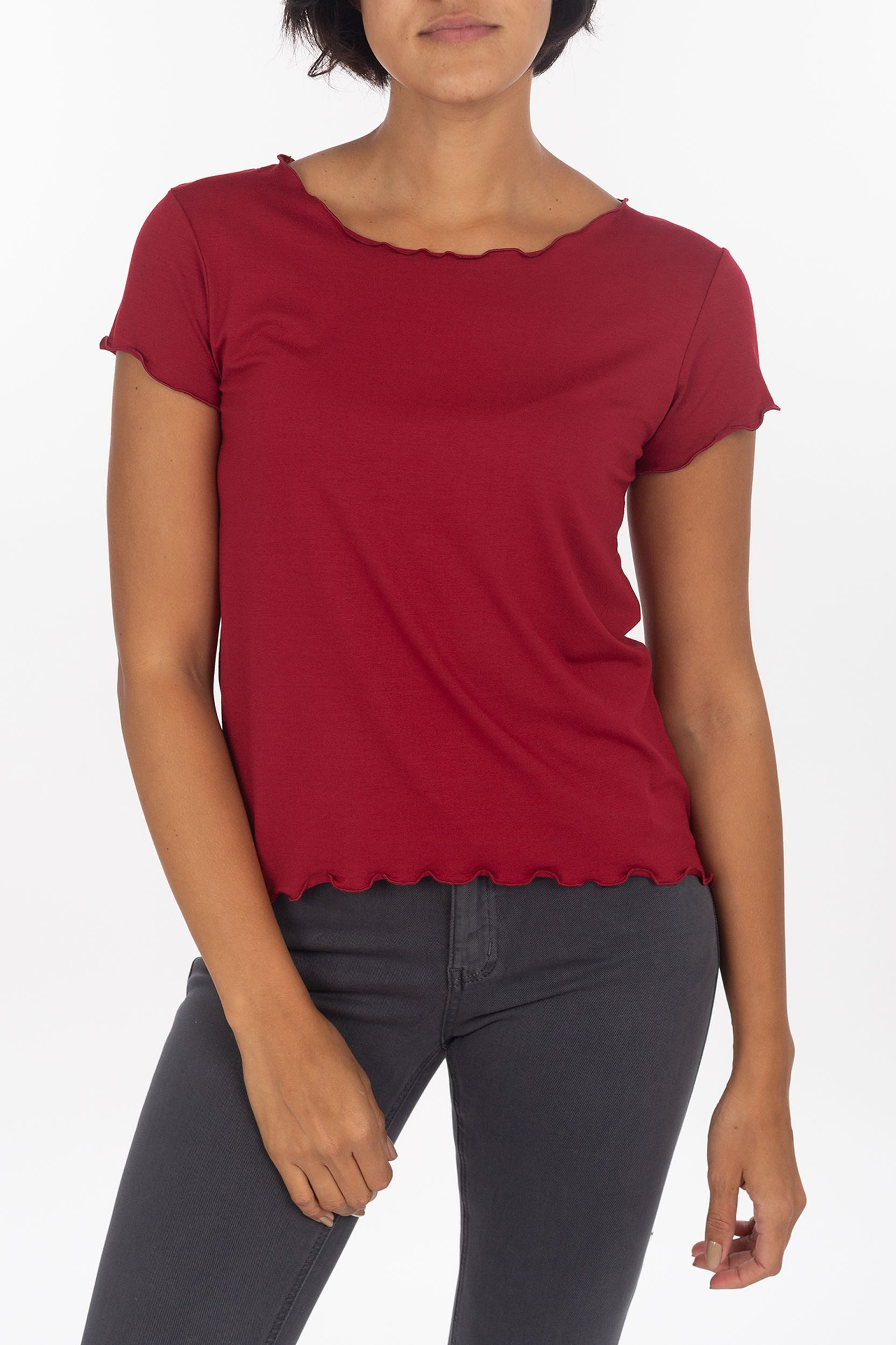 Dieses Basic T-Shirt darf auf keinen Fall in Ihrem Kleiderschrank fehlen! Es hat unten und an den Ärmeln einen Wellensaum und kann als Grundlage für diverse Outfits getragen werden. Kombinieren Sie es mit einer Jeans, einem Rock oder einer Bundfaltenhose und tragen Sie es unter Cardigans, Jeansjacken oder Blazern, die Möglichkeiten sind unendlich!
