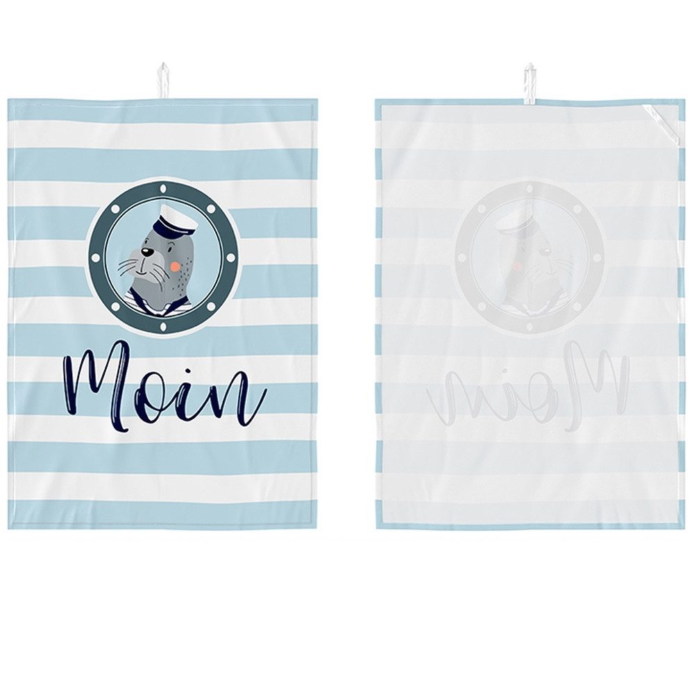 Lieferumfang: 1 Geschirrtuch Meerfreunde mit Seehund, Steifendekor und Moin Schriftzug