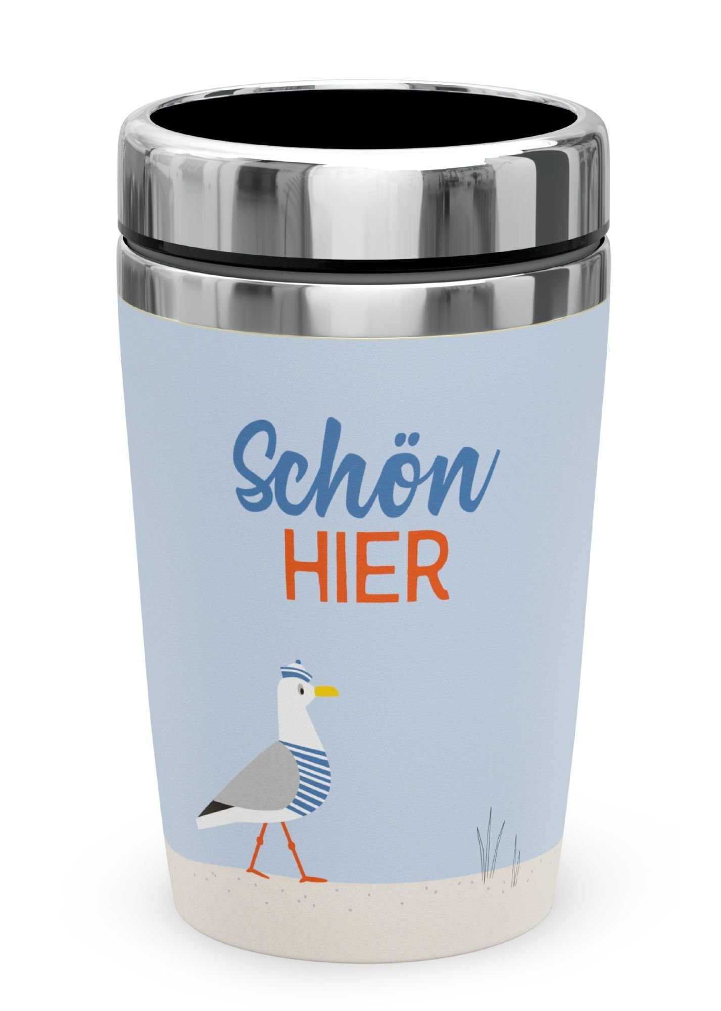 Mit dem angesagten "Thermobecher to go" hast Du Deinen Kaffee immer dabei. Ob zu Hause, unterwegs oder im Büro: Dein Kaffee bleibt durch den doppelwandigen Aufbau mit Edelstahleinsatz schön warm. Der praktische Schiebeverschluss ist perfekt, um die Trinköffnung schnell und sicher zu öffnen und zu schließen. Lass Deinen Becher beim Bäcker oder im Café füllen, vermeide dadurch Einwegbecher und tue so etwas für die Umwelt. Unter den Motiven findest auch Du den Thermobecher der perfekt zu Dir passt. Eine gute Idee für guten Kaffee! Tipp: Im Sommer hält der Thermobecher Dein Getränk mit Eiswürfeln schön kalt.