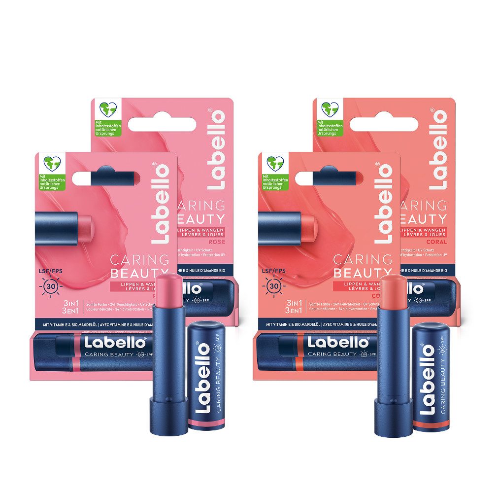 Lieferumfang | 2x Labello CARING BEAUTY ROSE (4,8 g) 2x Labello CARING BEAUTY CORAL (4,8 g) |