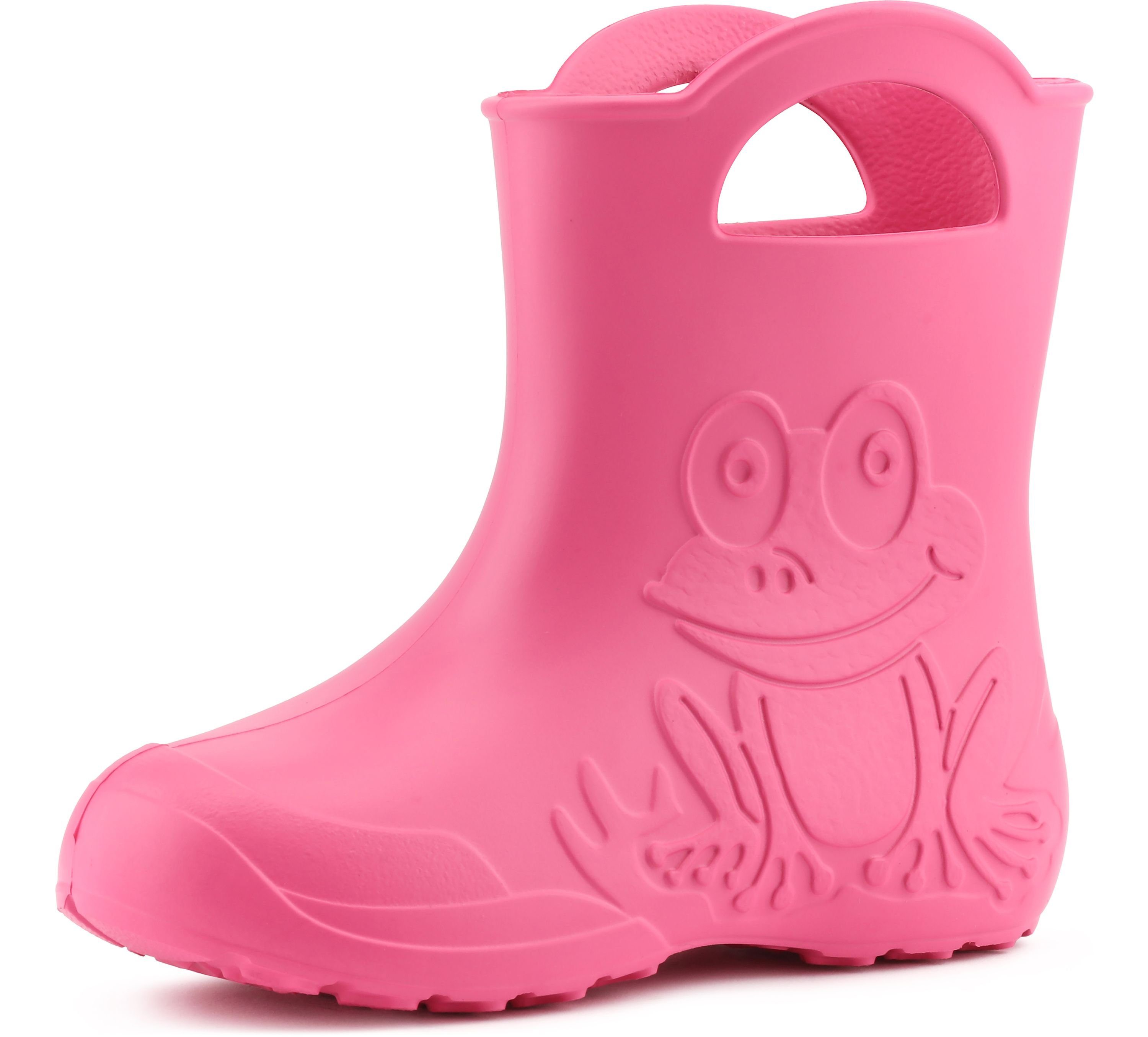 In der EU hergestellt. Leichte und bequeme Kinder Gummistiefel. Gummistiefel aus neuartigem, ultraleichtem EVA Kunststoff. Dabei handelt es sich um einen Schaumstoff, der mit Luftbläschen gefüllt wurde, was bewirkt, dass die Produkte sehr leicht (die Gummistiefel wiegen etwa 200g), bequem und elastisch, aber gleichzeitig auch widerstandsfähig sind. Das Material ist gänzlich wasserfest, was vor dem Einfluss niedriger Temperaturen schützt. Die Gummistiefel wurden mit dem Gedanken an Kinder entworfen. Der innere Teil des Schuhs wurde entsprechend geformt, so um dem wachsenden Kinderfuß besten Komfort zu sichern. Die speziell stabilisierten Fersen schützen den Kinderfuß und sichern eine bessere Stabilisierung. Die Gummistiefel sind leicht an- und auszuziehen. Dank der großen Auswahl an Farben und abgebildeten Frosches wird Ihr Kind bestimmt etwas für sich finden. Die Farben können leicht von den auf dem Monitor dargestellten Farben abweichen, je nach den Parametern Ihres Monitors.