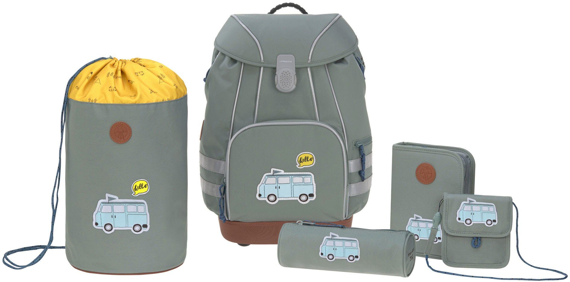 Komplett ausgerüstet für das Abenteuer Schule: Das LÄSSIG Adventure Tipi Schulranzen Set bietet mit Schulranzen, Sportbeutel, Brustbeutel, Federmappe und Schlampermäppchen das komplette Меню für die Schule. Все Produkte sind funktional und aus wasserabweisendem Außenmaterial. Der besondere Designclou bei diesem Schulranzen Set heißt: Pimp your bag. Mit drei mitgelieferten Textilstickern lässt sich das Schulranzen Set im trendigen Adventure Design nach Lust und Laune individuell gestalten. Kreativität und Gestaltungsfreude sind keine Grenzen gesetzt. Die Textilsticker lassen sich nach Belieben mehrmals ablösen und an einer neuen Stelle dekorieren. Warme Erdtöne und gelbe Farbakzente an Gurten und Griffen machen das Schulranzen Set zum echten Hingucker. Stabilität trifft Strapazierfähigkeit: Die Schulranzen Modelle verfügen nicht über die übliche Kastenform, sondern wirken wie ein sportlicher Kinderrucksack. Die gut gepolsterte, höhenverstellbare Rückenseite und die gepolsterten und stabilen Tragegurte ermöglichen ein angenehmes und rückenschonendes Tragen. Dafür sind die Tragegurte individuell einstellbar und können über einen zusätzlichen Brustgurt fixiert werden. Außerdem gibt es einen weiteren, abnehmbaren Gurt in Hüfthöhe, um eine zusätzliche Entlastung für den Rücken zu schaffen und das Gewicht der Schulranzen besser zu verteilen. Der Schulranzen lässt sich über einen Mini-Turn-Drehverschluss von Fidlock über eine halbe Drehung ganz einfach öffnen und schließt sich wieder selbstständig durch einen Magneten. Das Innere vom Schulranzen ist sehr geräumig und ermöglicht ein übersichtliches Verstauen der Schulsachen. Durch einen Kordelzug lässt sich die Öffnung des Innenraums auch zusammenziehen bzw. verkleinern, wodurch der Schulranzen insgesamt schmaler wird. Das zusätzliche Vorderfach ist ideal, um dort beispielsweise ein Pausenbrot zu verstauen. Des Впередen gibt es - versteckt an einer der Seiten - eine Tasche, in der ein Regenschutz integriert ist. Dieser lässt sich leicht aus der Tasche nehmen, um ihn bei Regen über den ganzen Schulranzen zu ziehen. Für die Sicherheit auf dem Schulweg sorgen die 3M Scotchlite Reflektoren vorne und an den Seiten der Schultasche. So wird das Kind bei schlechter Sicht, Dämmerung und Dunkelheit besser wahrgenommen.