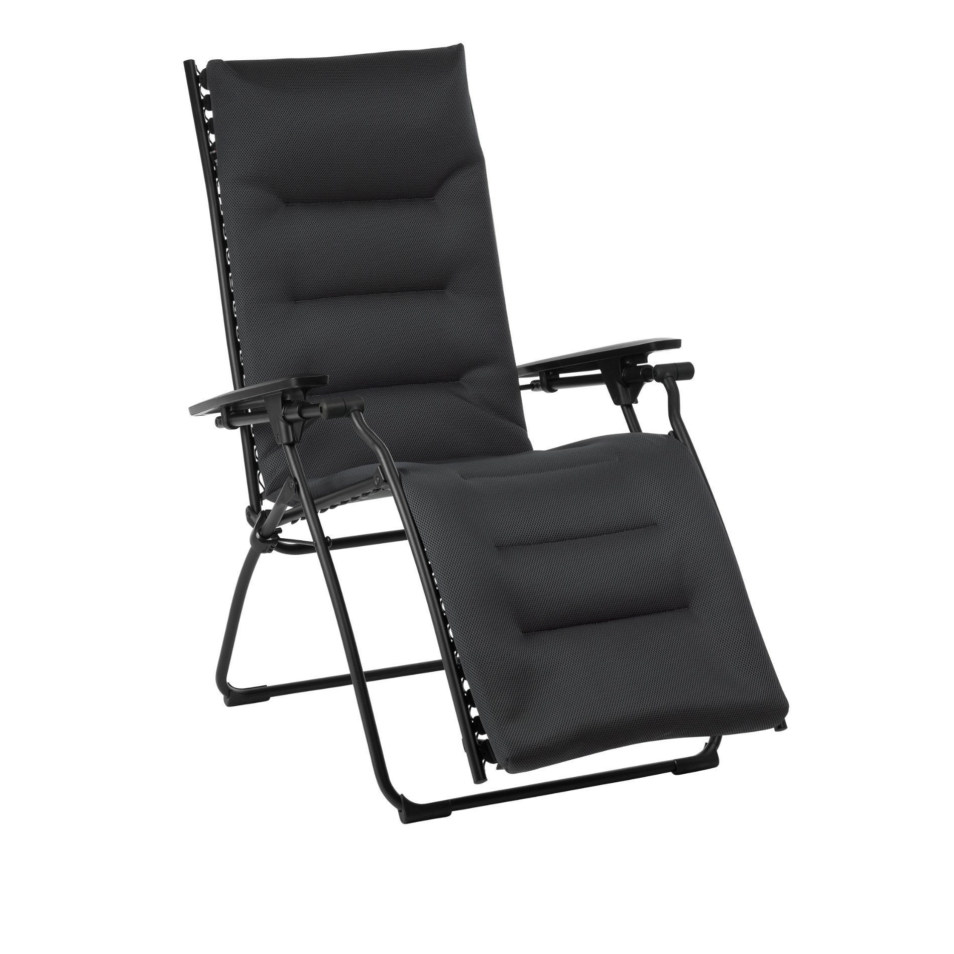 Das Gestell besteht aus lackiertem Stahlrohr in HLE-Qualität (Haute Limite Elastique), elegant in Schwarz. Die Sitz- und Rückenfläche besteht aus dem hochwertigen AirComfort® Outdoor-Textilgewebe, das bequem, luftdurchlässig, schnell trocknend und UV-resistent ist. Der Sessel bietet verschiedenen Sitz- und Liegepositionen, inklusive der "Schwerelosigkeit", für entspanntes Назадlehnen. Das patentierte Clip-System gewährleistet eine optimale Gewichtsverteilung und verbesserten Liegekomfort. Die festen Armlehnen aus schwarzem Harz sind ergonomisch geformt und ermöglichen stufenlose Anpassungen. Der abnehmbare Bezug mit integriertem Kopfpolster und Bodenschonern für Stabilität komplettieren diesen hochwertigen Relaxsessel. Ideal für Ihre persönliche Ruheoase.
