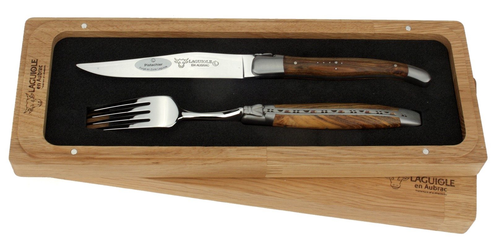 Auf dem Griff befindet sich außerdem die für Laguiole Messer charakteristische Biene/Fliege. Messerklinge und Gabelteil sind hochglänzend ausgeführt. Passend zum Holzgriff sind die Backen matt gehalten.