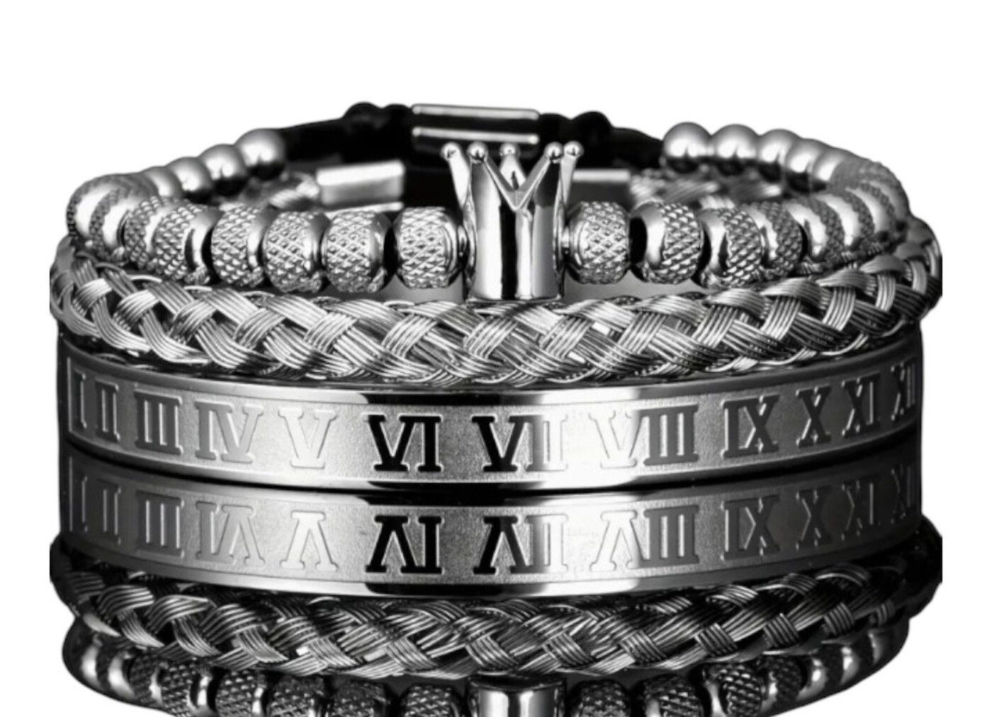 Stilvolles Herren-Armband-Set – Eleganz trifft auf modernen Charme Entdecken Sie das perfekte Accessoire für den modernen Mann mit unserem dreiteiligen Armband-Set. Dieses Set vereint zeitloses Design mit moderner Raffinesse und verleiht jedem Outfit eine stilvolle Note. Hochwertige Materialien: Das Set besteht aus einer Kombination von robustem Edelstahl, eleganten Perlen und einem verstellbaren Armreif. Royal Crown Charm: Ein königliches Kronen-Design als Highlight, das dem Set eine luxuriöse Ausstrahlung verleiht. ⚙ Verstellbarer Komfort: Der offene Armreif mit römischen Ziffern ist individuell anpassbar und sorgt für einen bequemen Sitz. Vielfältige Farboptionen: Wählen Sie aus klassischen Farben wie Schwarz, Gold, Weiß, Grau oder Schwarz – passend zu jedem Stil. Eleganz für jeden Anlass: Ob im Büro, bei besonderen Events oder im Alltag – dieses Armband-Set ist das ideale Accessoire für jeden Moment. Ein perfektes Geschenk für Männer, die Wert auf Stil und Qualität legen. Setzen Sie mit diesem edlen Schmuckstück ein Statement und ergänzen Sie Ihren Look mit einem Hauch von Luxus!
