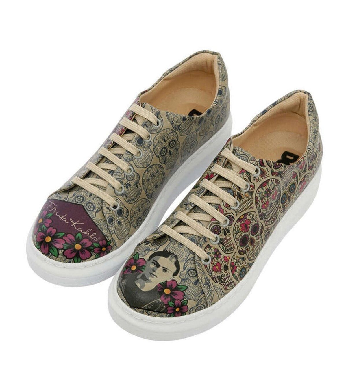 Tauchen Sie ein in die faszinierende Welt der Kunstlegende Frida Kahlo mit unseren einzigartigen Sneakern. Jedes Paar ist eine lebendige Erinnerung an ihr außergewöhnliches Leben und Werk. Das Schuhdesign vereint auf eindrucksvolle Weise Leben und Tod, indem es Fridas Kunst mit ikonischen Elementen ihrer surrealistischen Werke kombiniert. Diese Sneaker sind mehr als nur Schuhe; sie sind eine Hommage an eine der inspirierendsten Künstlerinnen aller Zeiten. Mit ihrem künstlerischen Flair und ihrem einzigartigen Stil sind diese Sneaker ein Must-Have für Kunstliebhaber und Frida-Kahlo-Fans.