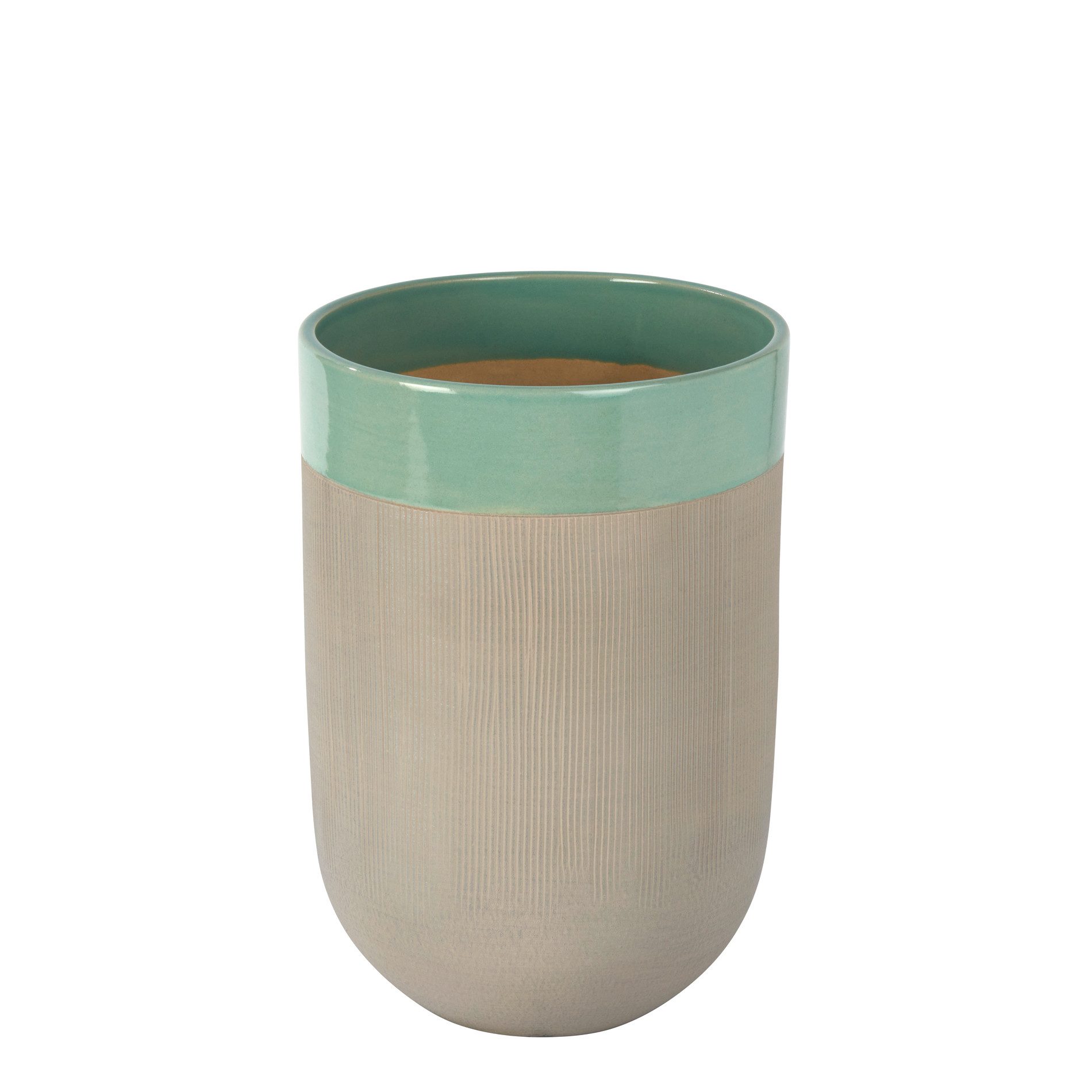 Dekorative Gefäße aus Keramik setzen besondere handwerkliche Akzente in Ihrem Wohnambiente. Bei den handgefertigten Mizo Gefäßen schafft der Kontrast von farbiger Glasur zum mattgrauen Körper eine spannende Verbindung der Oberflächengestaltung. Angrenzend an den farbigen Bereich werden dekorative Linien mit einem Kamm in den noch weichen, leicht silbrig schimmernden Ton geritzt, der anschließend bei 1000 Grad gebrannt wird. Die klassische Formensprache rundet das Gesamtbild dieser Gefäße ab. Die handgefertigte Verarbeitung und die individuelle Glasur machen jedes Stück zu einem Unikat, das sich besonders farblich unterscheiden kann. Mizo setzt Frisch- und Trockenblumensträuße besonders schön in Szene. Da Keramik aufgrund ihrer natürlichen Beschaffenheit grundsätzlich Wasser aufnimmt und speichert, empfehlen wir, bei Verwendung von Frischblumen ggf. einen Glaseinsatz oder einen Untersetzter zu verwenden.