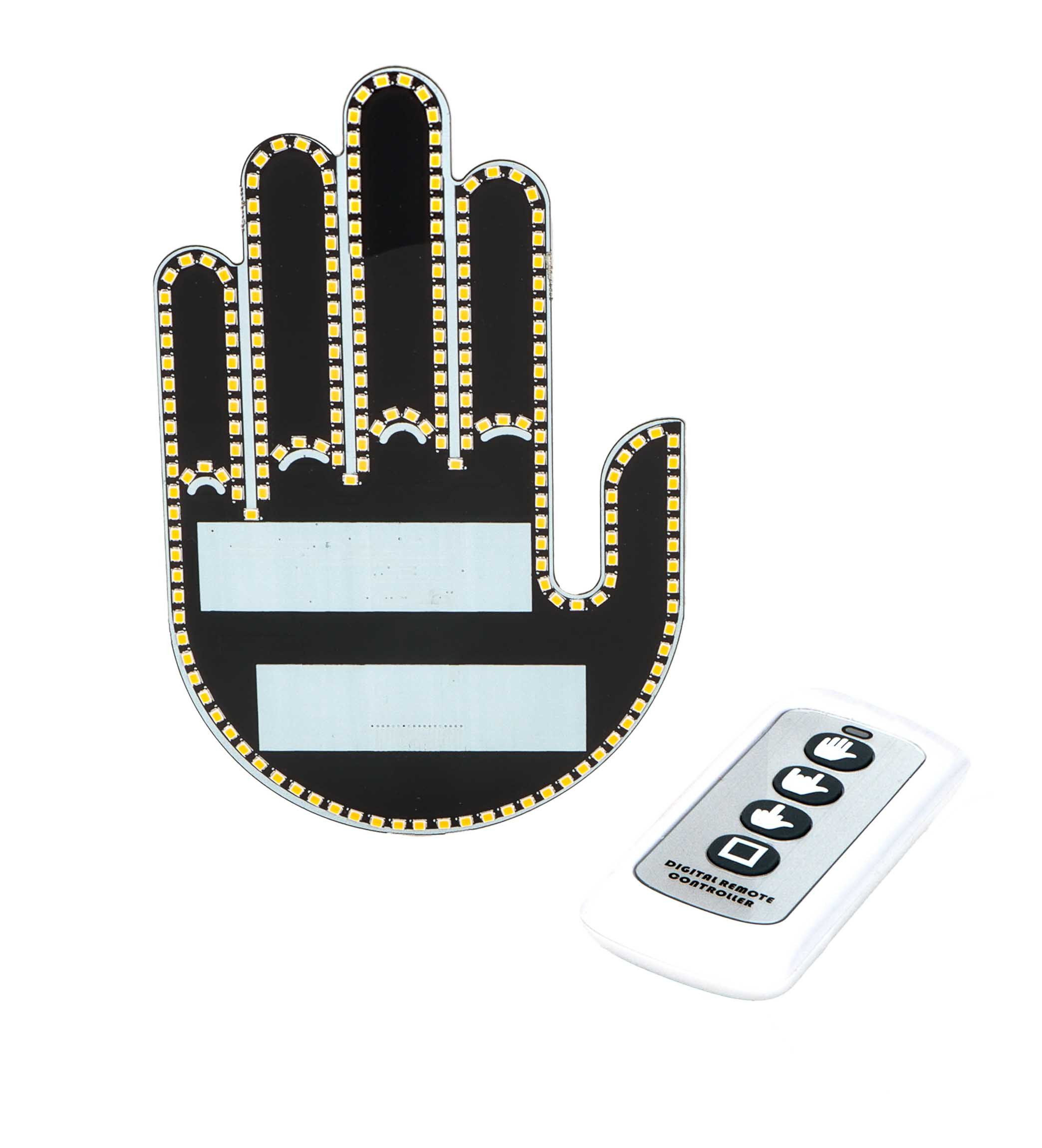 Mit dieser Hand, bestückt mit 203 orange leuchtenden LEDs, die mit Klettband auf doppelseitigem Klebepad im Rückfenster befestigt wird. Betrieben werden die LEDs mit drei handelsüblichen AA-Batterien. Außerdem gehört zum Lieferumfang eine ebenfalls batteriebetriebene Fernbedienung. In beiden Fällen sind die Batterien nicht im Lieferumfang enthalten. Neben dem An / Aus-Schalter haben Sie drei Sensorknöpfe zu Verfügung. Der oberen Button zeigt die gesamte Hand, die z.B. Stopp aussagt und vor einem kommenden Stau warnen kann. Darunter lassen sich die sog. Teufelshörner, für die Freunde des Rock'n Rolls, anschalten. Der erhobene Mittelfinger leuchtet beim Bedienen des dritten Buttons auf. Mit Ihrem neuen, coolen Hand-Gestenlichtern können Sie warnen, für mehr Sicherheit sorgen, oder einfach einmal Ihre Meinung zeigen. Die LEDs, die eine Leuchtkraft von ca. 25 Metern aufweisen, lassen sich, als lustiger Spaß oder Wink mit dem Zaunpfahl, auch super verschenken. Ob als cooles Auto-Gadget oder als witziges Mitbringsel, Sie werden bestimmt Spaß haben mit Ihrem neuen Hand-Gestenlicht.