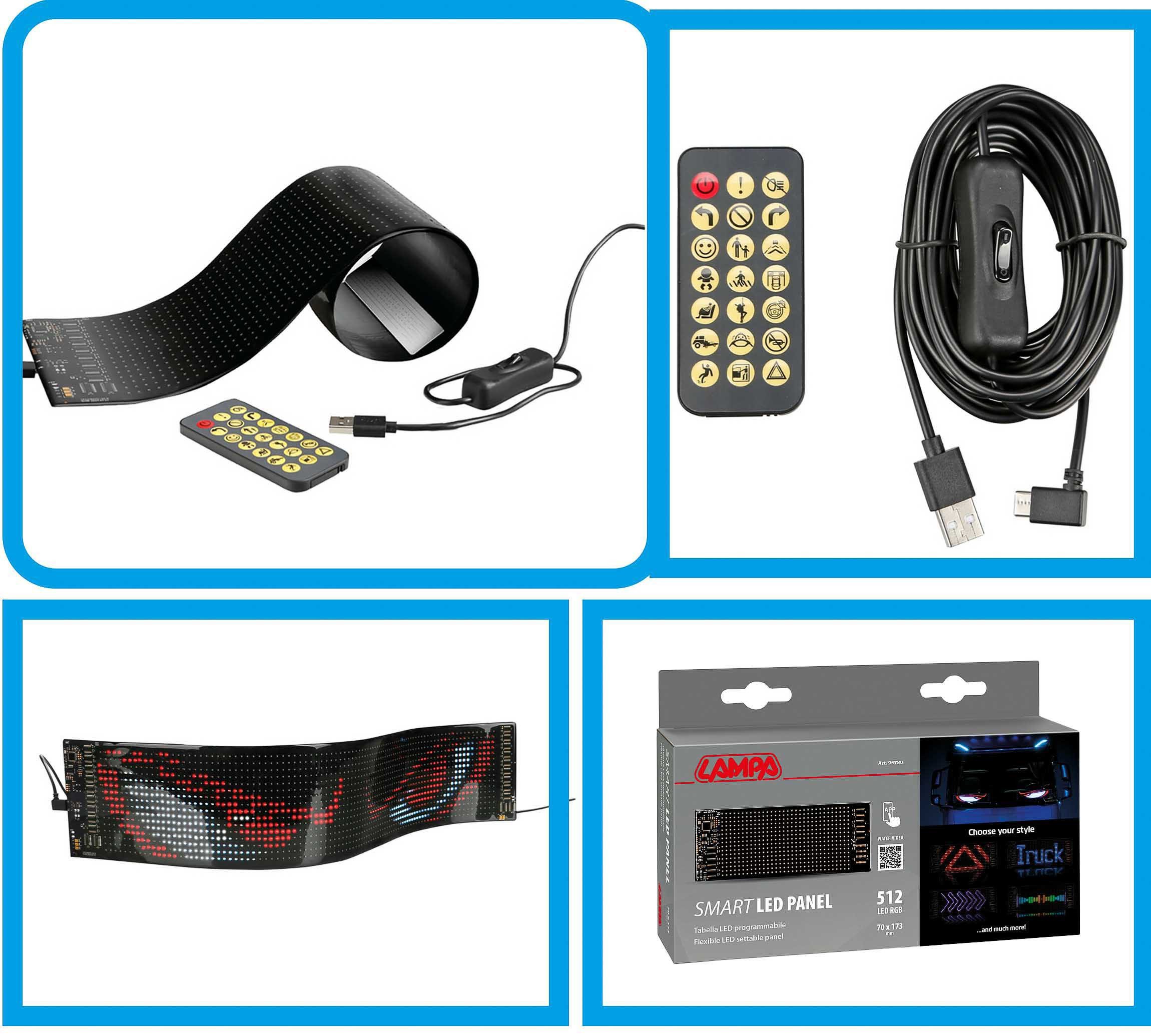 Lieferumfang | 1x Smart-Led-Panel mit 512 LEDs und USB-C-Anschluß, 1x Fernbedienung mit Batterien, 1x USB-Kabel, 1x doppelseitiges Klebepad, 1x Betriebsanleitung, 1x Verpackung mit QR-Code zum Video |