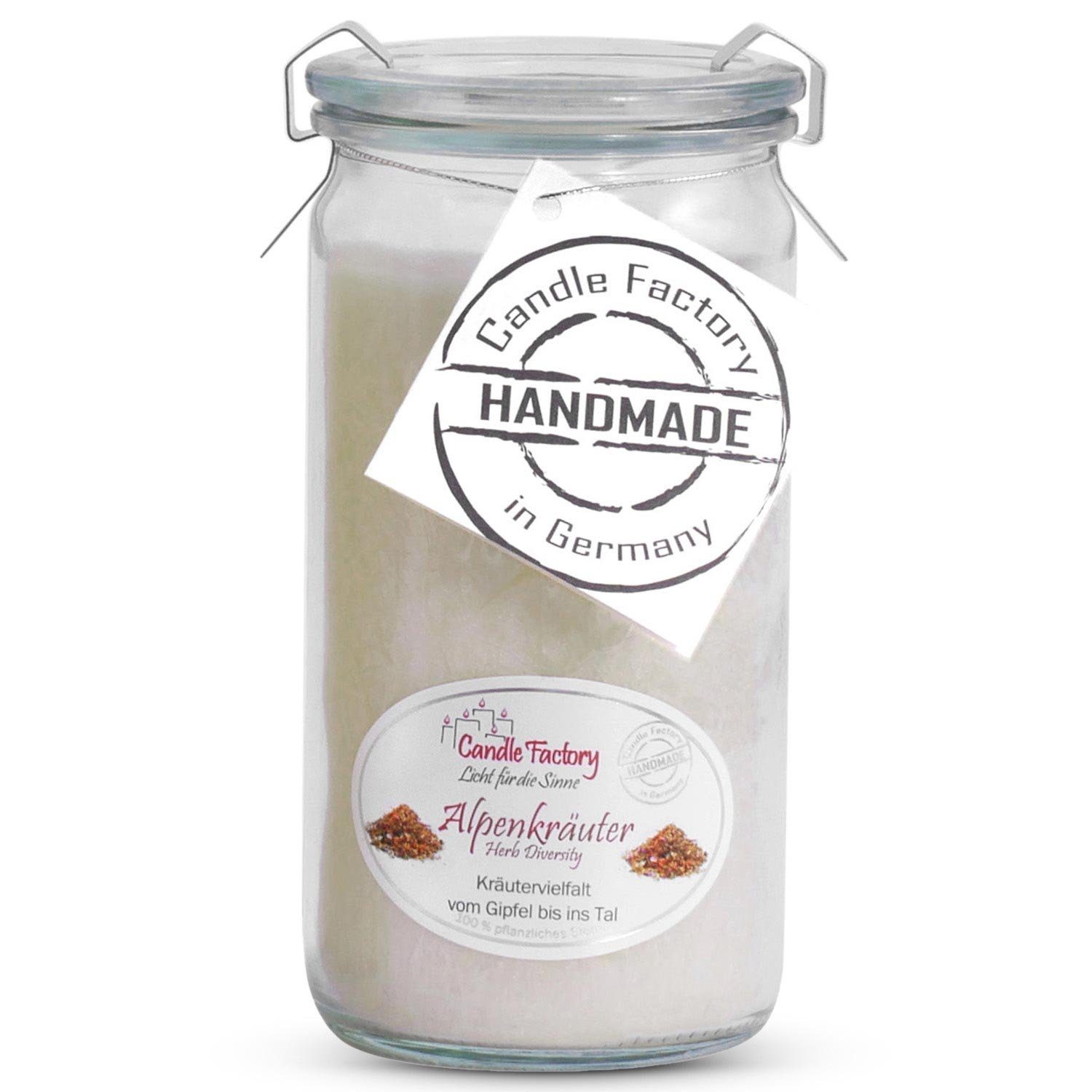 Landshop24 Duftkerze Candle-Factory Duftkerze aus Stearin im Weckglas Mini Jumbo (Duft "Alpenkräuter), brennt bis zu 70h