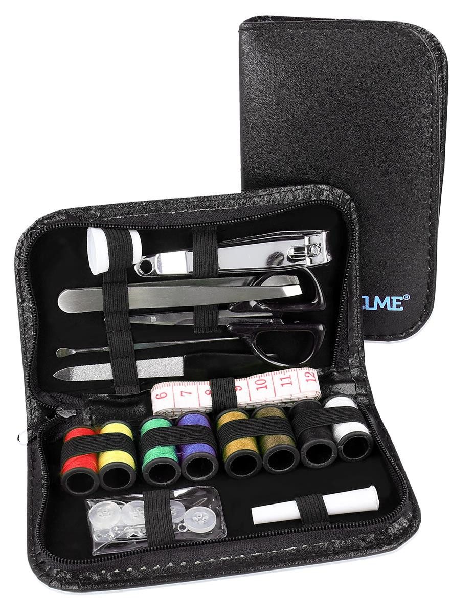 Lantelme Reise Näh und Maniküren Set. Reisenähset in schwarzer Ledertasche mit Reißverschluss. Kompaktes Design. Das kompakte Nähset ist für schnelle Reparaturen geeignet, sei für zu Hause, auf Reisen oder Notfall-Reparaturen auf der Arbeit oder beim Camping. Um unterwegs kleinere Näheingriffe vorzunehmen. Mit unserem Näh Utensilien Set sind Sie jederzeit gut vorbereitet. Für den Profinäher oder den Amateur gleichermaßen geeignet. Im Reisenäh Set vorhanden sind ein Fingerhut aus Kunststoff, ein Bandmaß (beidseitig bedruckt: 150cm bzw. 60 inch), 8 mal bunter Zwirn, ein Nadelbehälter mit Nähnadel, Sicherheitsnadel und ein kleiner Beutel mit diversen Nähutensilien. Im Set enthalten ist noch ein kleine Mani- Pediküren Set mit einem Nagelschneider, eine Pinzette, eine Nagelschere, eine Nagelfeile, ein Nagelhautentferner. Die Maße betragen vom Reißverschlussetui sind 14 x 8 x 2 cm.