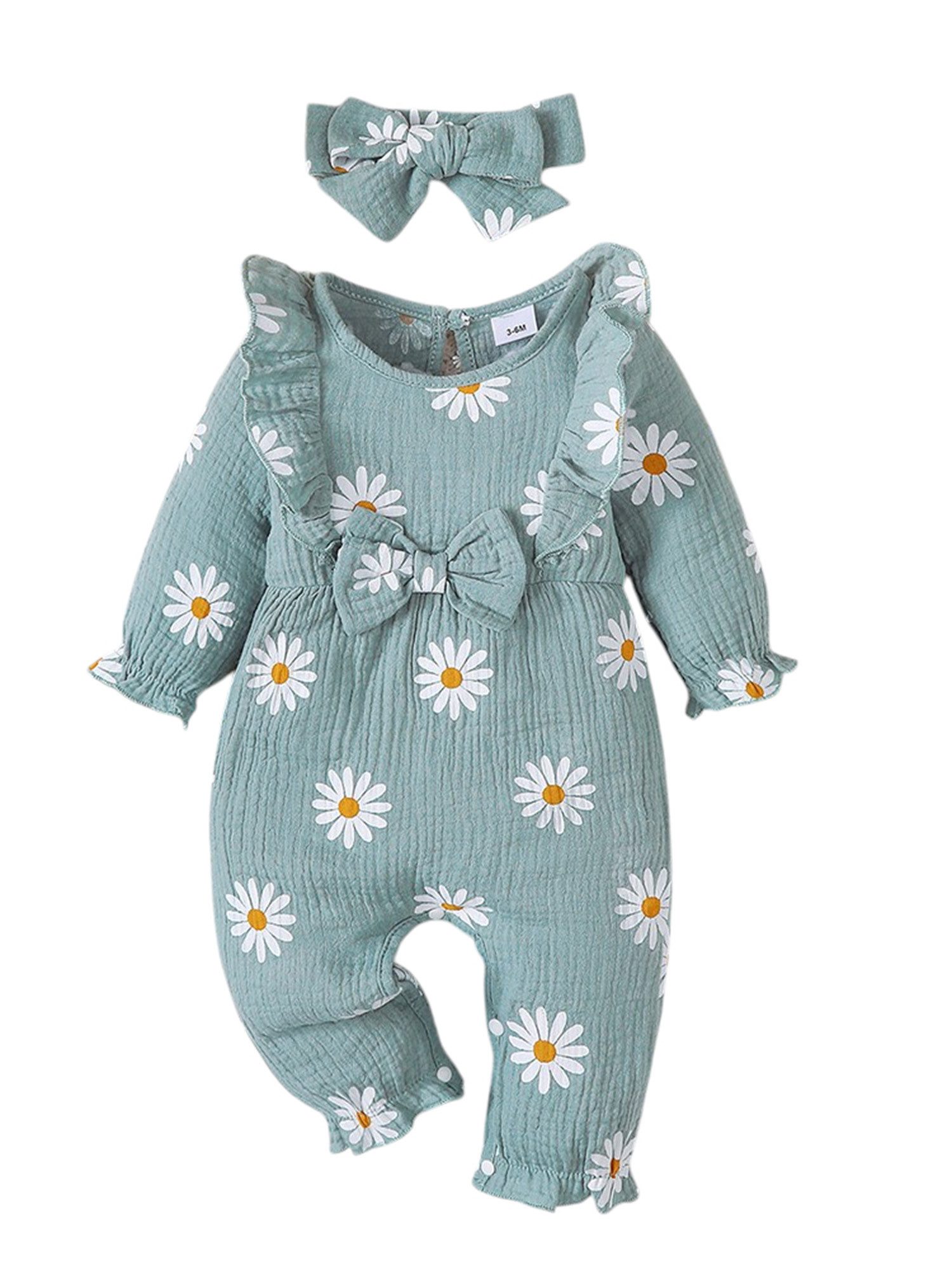 Hergestellt aus hochwertigem Baumwollstoff, sorgfältig handgefertigt, um Pilling zu vermeiden, farbecht, waschbar und langlebig zu sein. Die zarte Textur ist weich und angenehm auf der zarten Babyhaut. Die zarte Kombination aus Gänseblümchen, Rüschen und Schleifen strahlt kindlichen Charme aus und verströmt gleichzeitig einen leichten, rustikalen Stil.