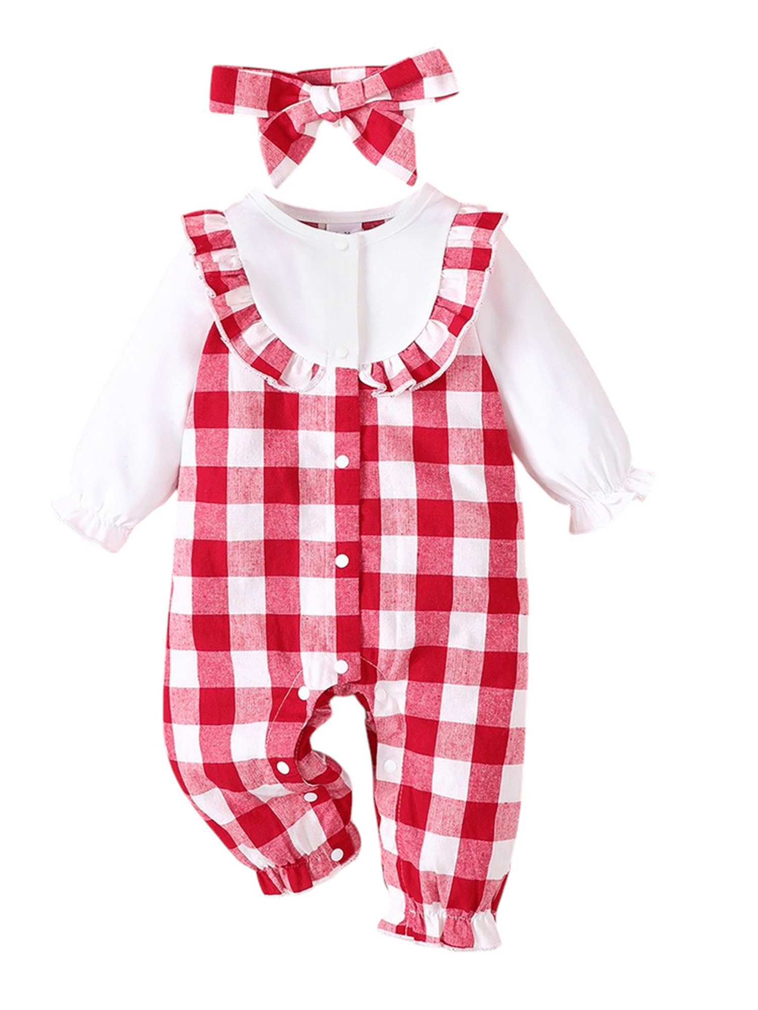 Dieser langärmelige Rundhals-Overall für Babys mit Stirnband ist für Frühling und Herbst konzipiert. Das rot-weiße Karomuster wirkt frisch und süß und verströmt eine festliche Atmosphäre. Es eignet sich hervorragend für besondere Anlässe wie Weihnachten, Partys oder Familienfeiern. Das Rüschendesign unterhalb des Ausschnitts verleiht dem Baby einen Hauch von Verspieltheit und Eleganz und lässt es noch hübscher und lebendiger wirken.