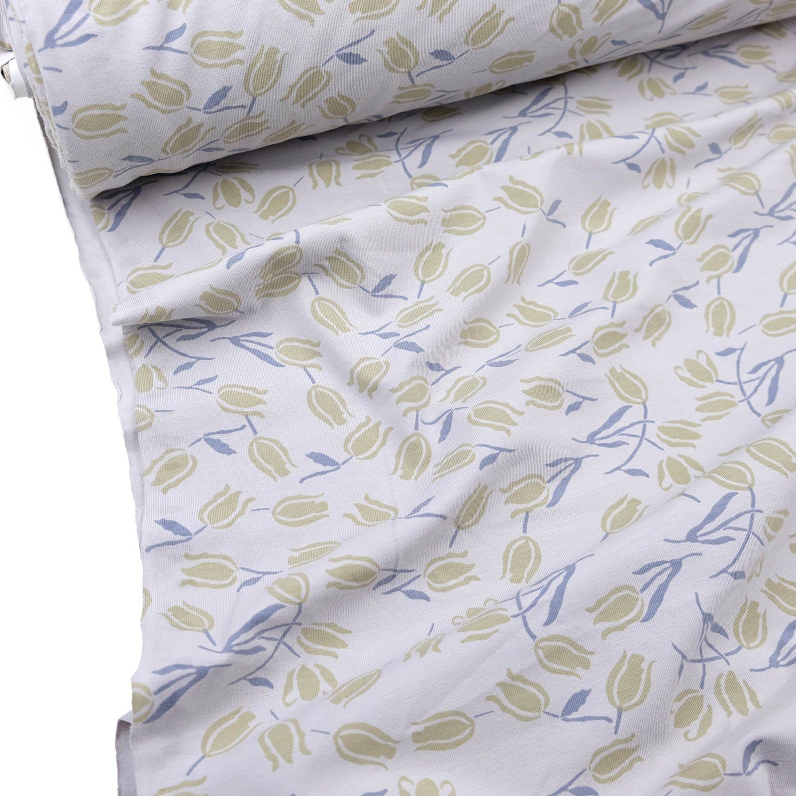 Der hochwertige Bio-Baumwolljersey trägt sich angenehm leicht und fällt schön weich, sieht edel und feminin aus. Der Stoff ist elastisch, engt aber nicht ein. Der dezente, feminine Blumendruck ist zeitlos schön. Der Stoff liegt mit 1,65 m breiter als üblich. Dadurch lassen sich Schnittmuster platzsparend anordnen und auch größere Projekte realisieren.