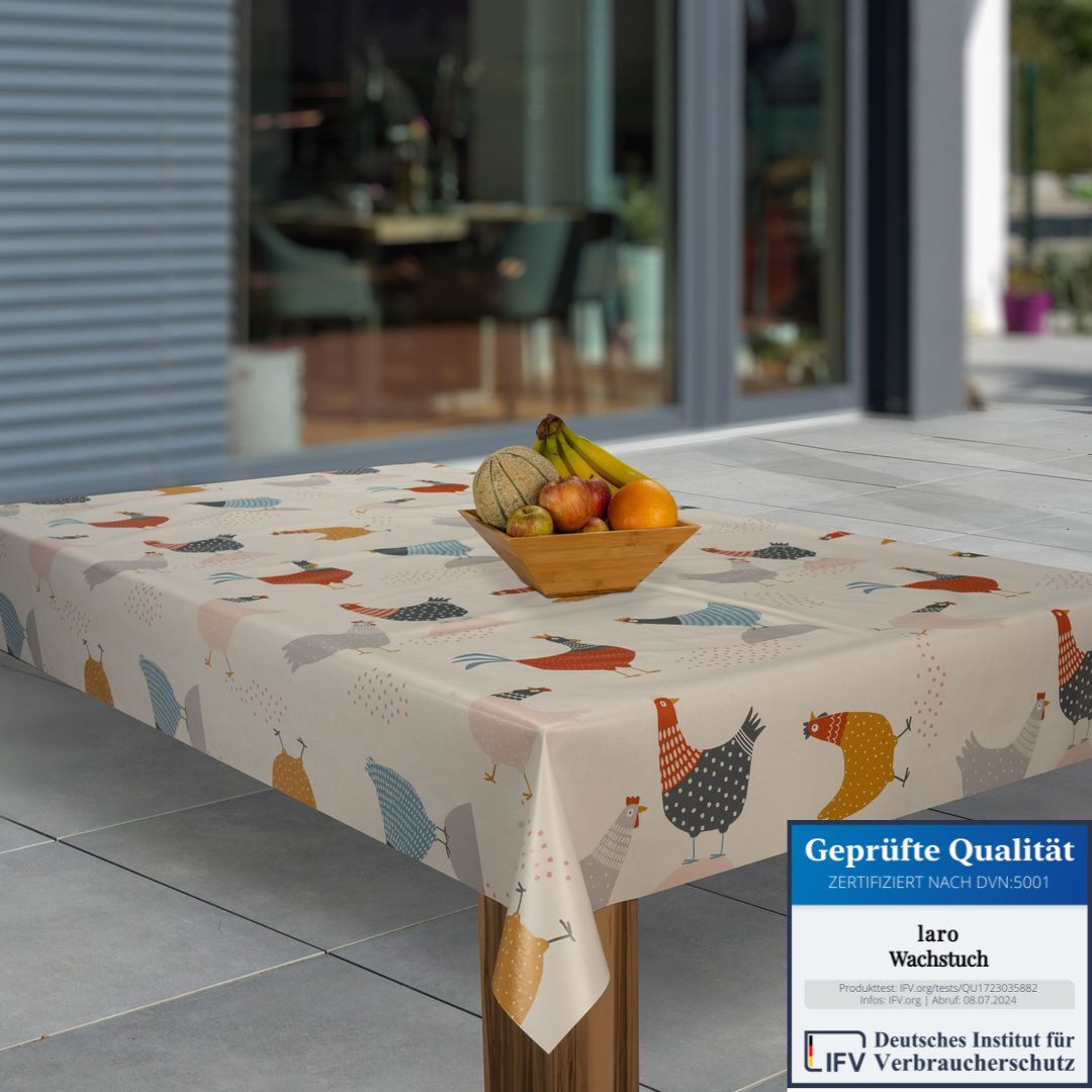 Die Tischdecke ist sehr hübsch mit den lustigen Hühner die Qualität findet ich super alles perfekt