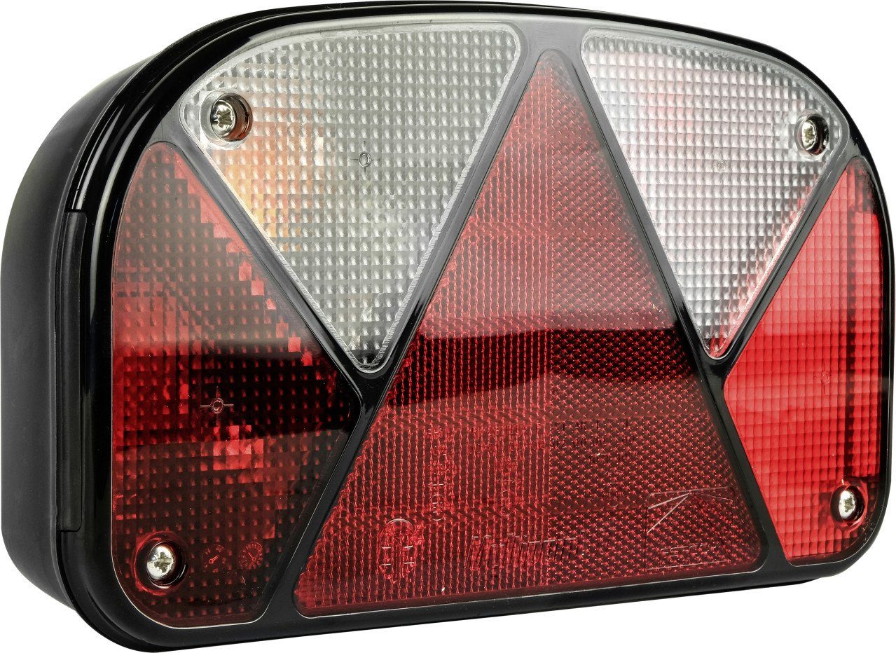 Produktdetails: Rückleuchte komplett, mit Leuchtmittel | links | 6 Funktionen: Schlusslicht, Bremslicht, Blinker, Dreieckrückstrahler, Kennzeichenbeleuchtung, Nebelschlussleuchte | Spannung: 12 V | Maß: ca. 23,5 x 13,5 x 5,5 cm (B x H x T) | Anschluss: 5-polig Bajonett |