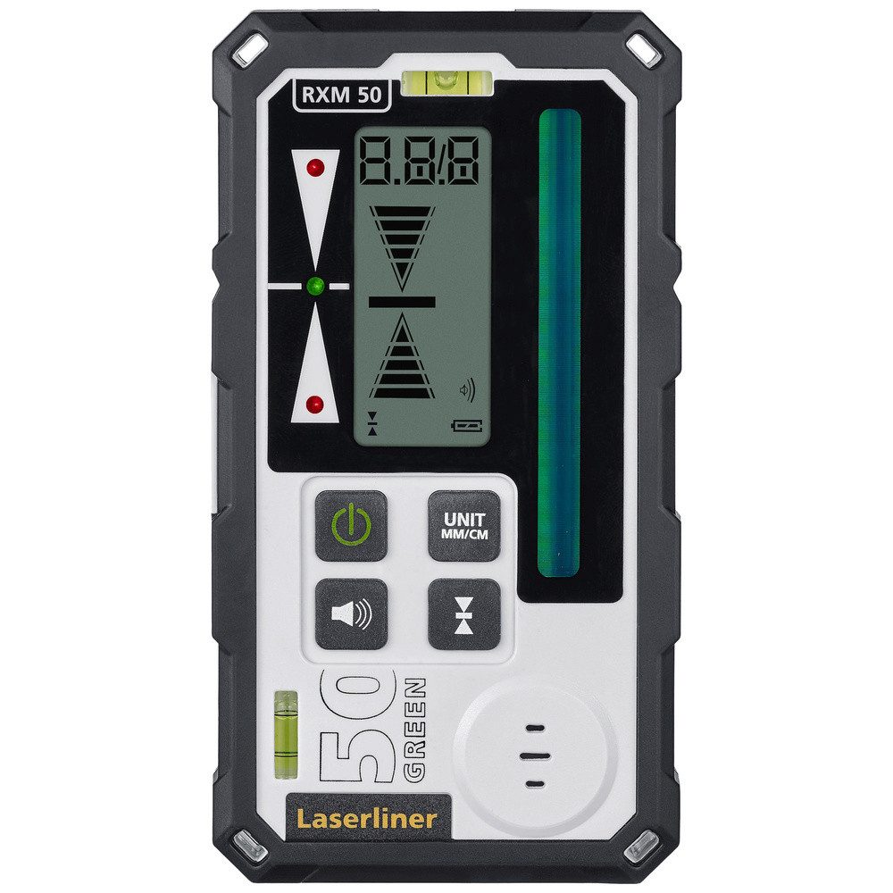Dieser Laserempfänger ermöglicht schnelle Ausrichtarbeiten im Nah- und Fernbereich und eignet sich für alle grünen Linienlaser mit GRX-READY Technologie. Er detektiert zeitsparend die mit hoher Frequenz pulsierenden Laserlinien bis zu einer maximalen Entfernung von 50 Metern. Per Pfeilsymbol und Millimeter-Anzeige wird der Anwender über den exakten Höhenunterschied des Laserstrahls zur Markierebene informiert. Das Ablesen der Messwerte ist dank großer LC-Displays auf beiden Seiten des Empfängers einfach und in kurzer Zeit möglich. Durch das Display auf der Rückseite besteht die Möglichkeit, auch entgegen der Austrittsrichtung des Laserstrahls zu arbeiten und die Messwerte abzulesen