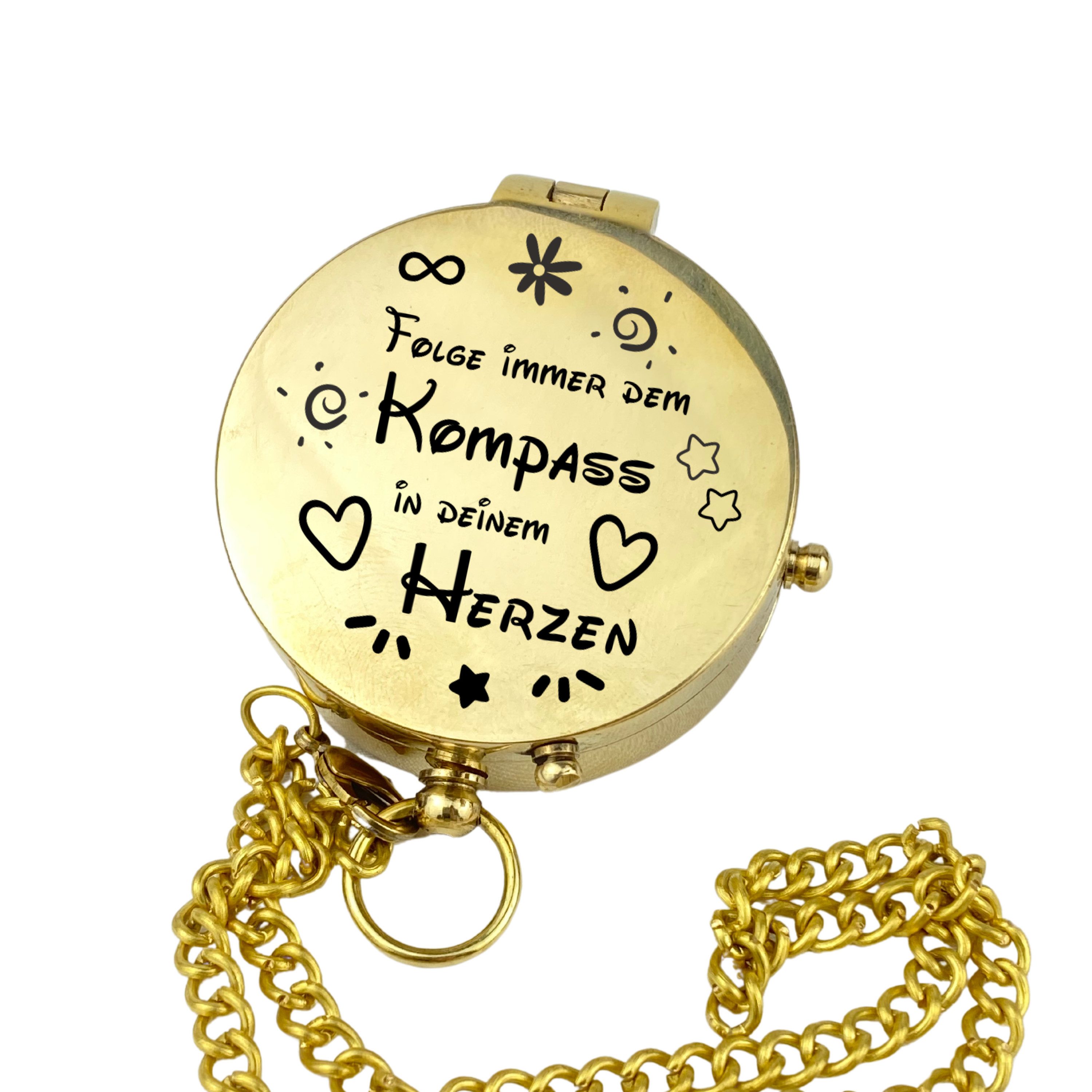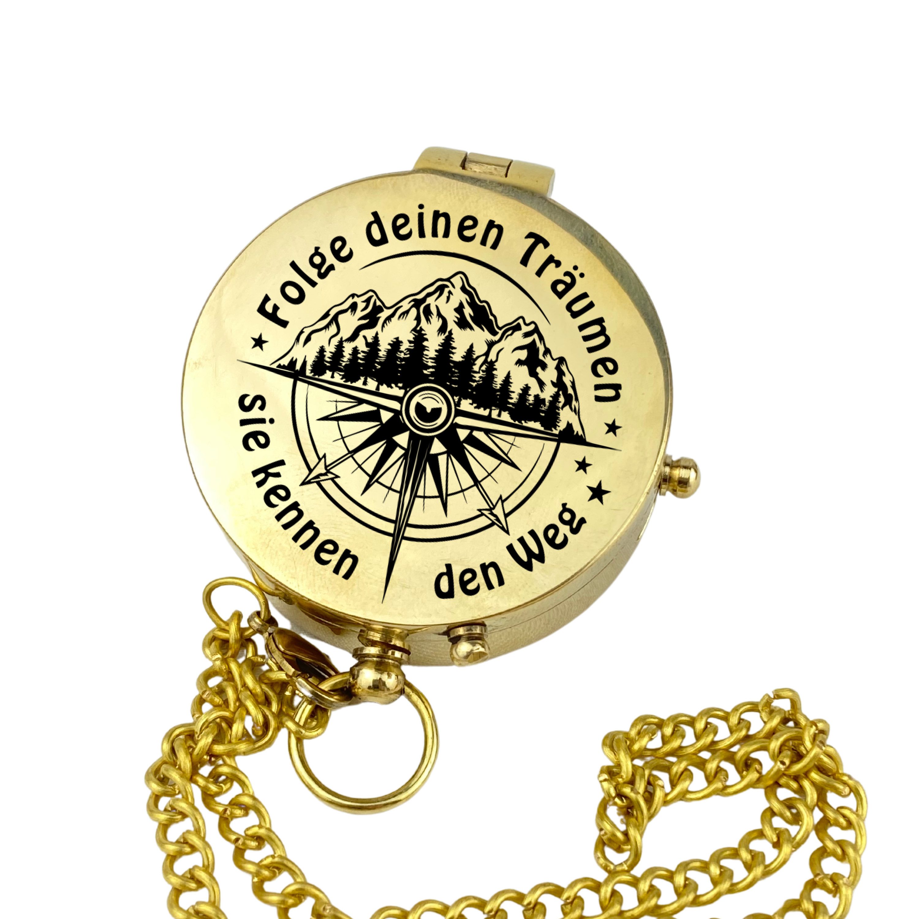 Kompass aus poliertem Messing an einer Kette mit Gravur auf dem Deckel, 9 verschiedene Motive stehen zur Auswahl.
