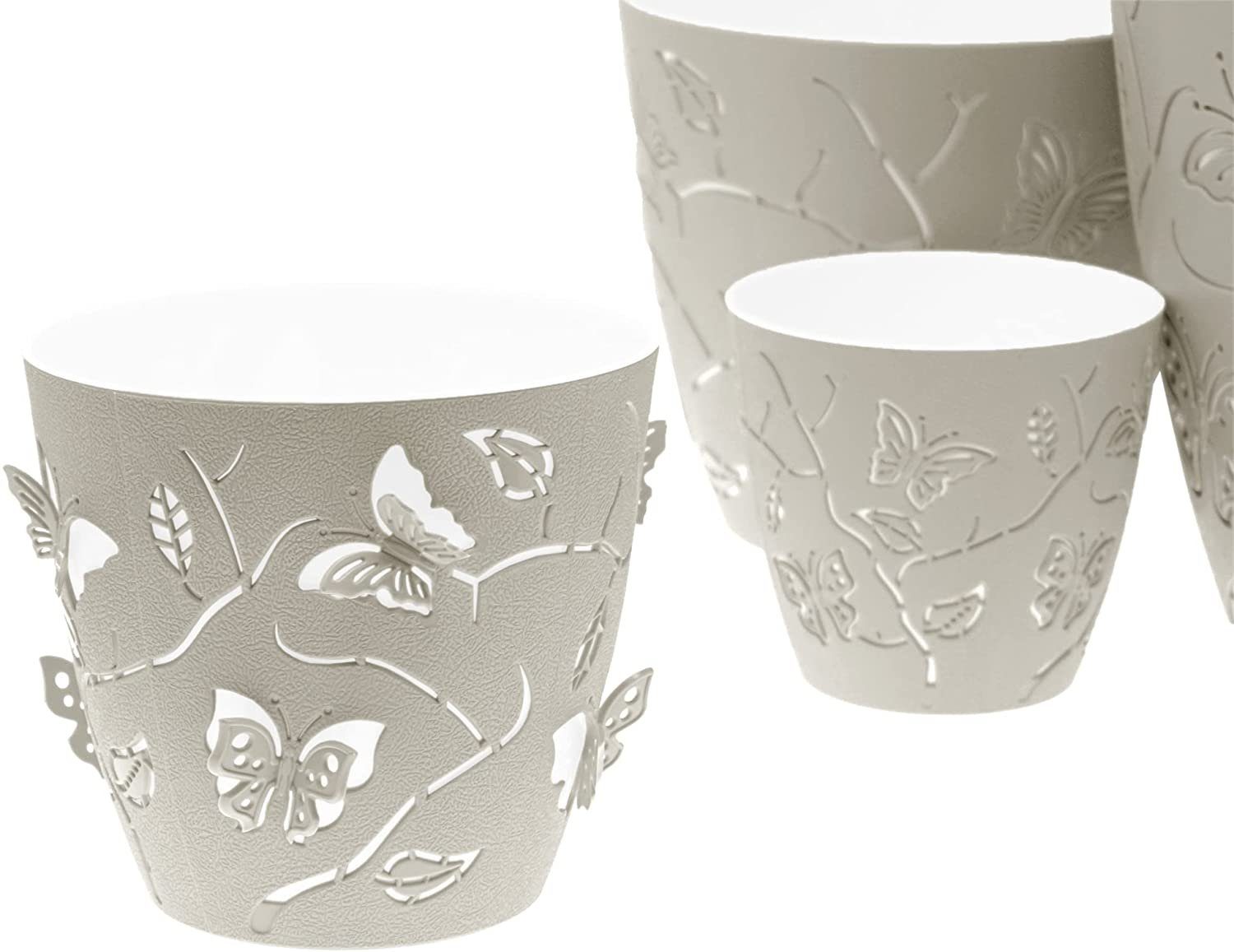 Unsere Deko Pflanztöpfe bestehen aus einem weißen Untertopf und dem dekorativen Übertopf. Bequem lässt sich die Erde in den weißen Untertopf hineinlegen, kleine Löcher im Innentopf sorgen für ein leichtes Abfließen von Wasser in den Obertopf.