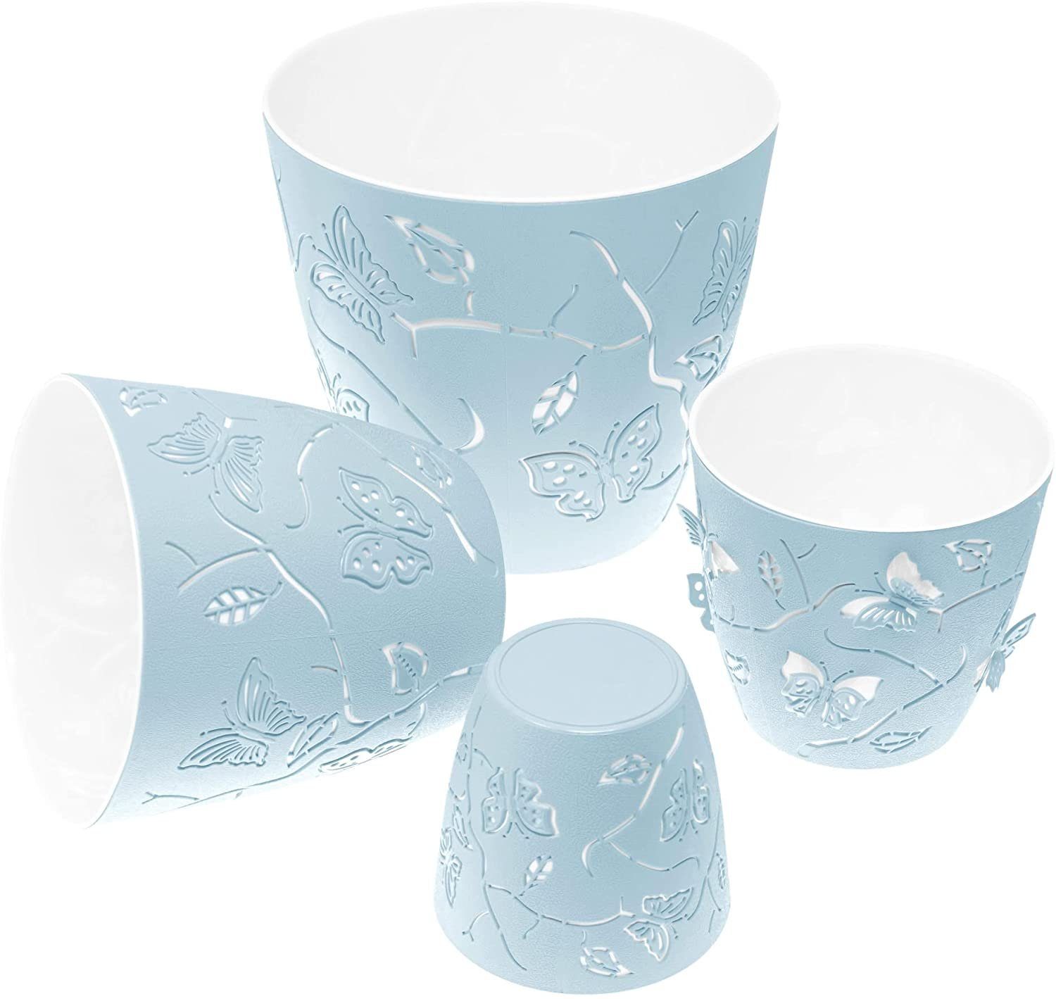 Auch optisch begeistern unsere modernen Pflanzkübel. In der schönen Topf Farbe Hell Blau sind die Kunststoff Blumentöpfe gehalten und stehlen überall die Show. Das unbestrittene Highlight an diesen neuen Pflanztöpfen sind die eingebrachten Schmetterlinge. Sie bekommen die Blumenschalen anfangs mit glatter Oberfläche. Doch lassen sich die hübschen Falter aus der Einfassung herauslösen und erzeugen einen wunderschönen 3D Effekt. So als würden echte Schmetterlinge auf den Übertöpfen sitzen. Ganz nach Ihren Wünschen gestalten Sie Ihre Pflanzkübel, wie es Ihnen gefällt. Und als Geschenk Idee zum Geburtstag oder zu einer Einweihung begeistern unsere erstklassigen Anzuchttöpfe wirklich jeden!