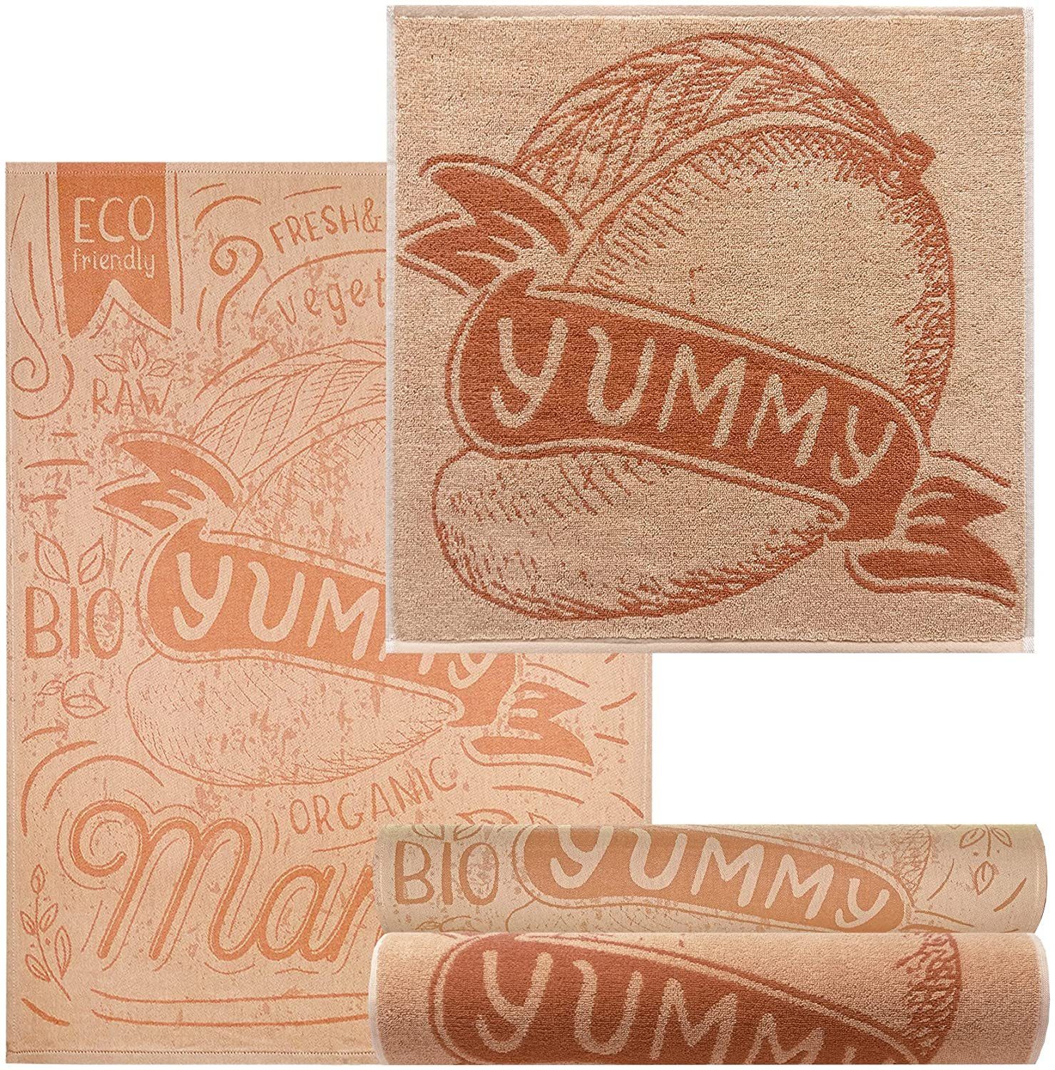 In diesem fusselfreien, 4 teiligen Küchenset sind je 2x ca. 50 x 70 cm Geschirrtücher und 2x ca. 50 x 50 cm Frotteetücher enthalten. Ideal geeignet sind die Abtrockentücher zum Wischen, Polieren oder zum Abtrocknen der Hände sowie Geschirr. Dank der großen Geschirrhandtücher geht der Haushalt im Nu vorbei und Sie haben genug Zeit für Ihre Hobbys. Hergestellt sind die langlebigen Küchenhandtücher aus 100% Baumwolle, so haben Sie viel Freude mit unseren Wischtüchern und helfen Ihnen lange Zeit bei der Hausarbeit. Gleichzeitig umschmeicheln die quadratischen Frottee Trockentücher mit der Qualität 440 g/qm sanft Ihre Hände, sobald Sie Ihre Haut mit den Reinigungstüchern abtrocknen. Die saugstarken Geschirrtücher kommen mit der Qualität von 260 g/qm.
