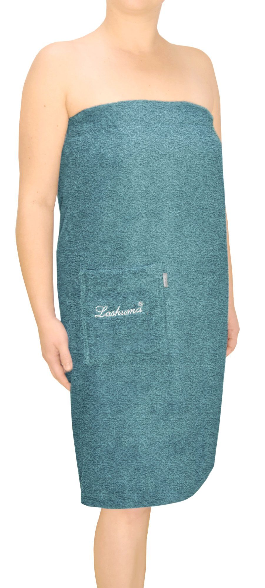 - Mit 8 Knöpfen und Gummizug ist der Saunarock frei anpassbar.