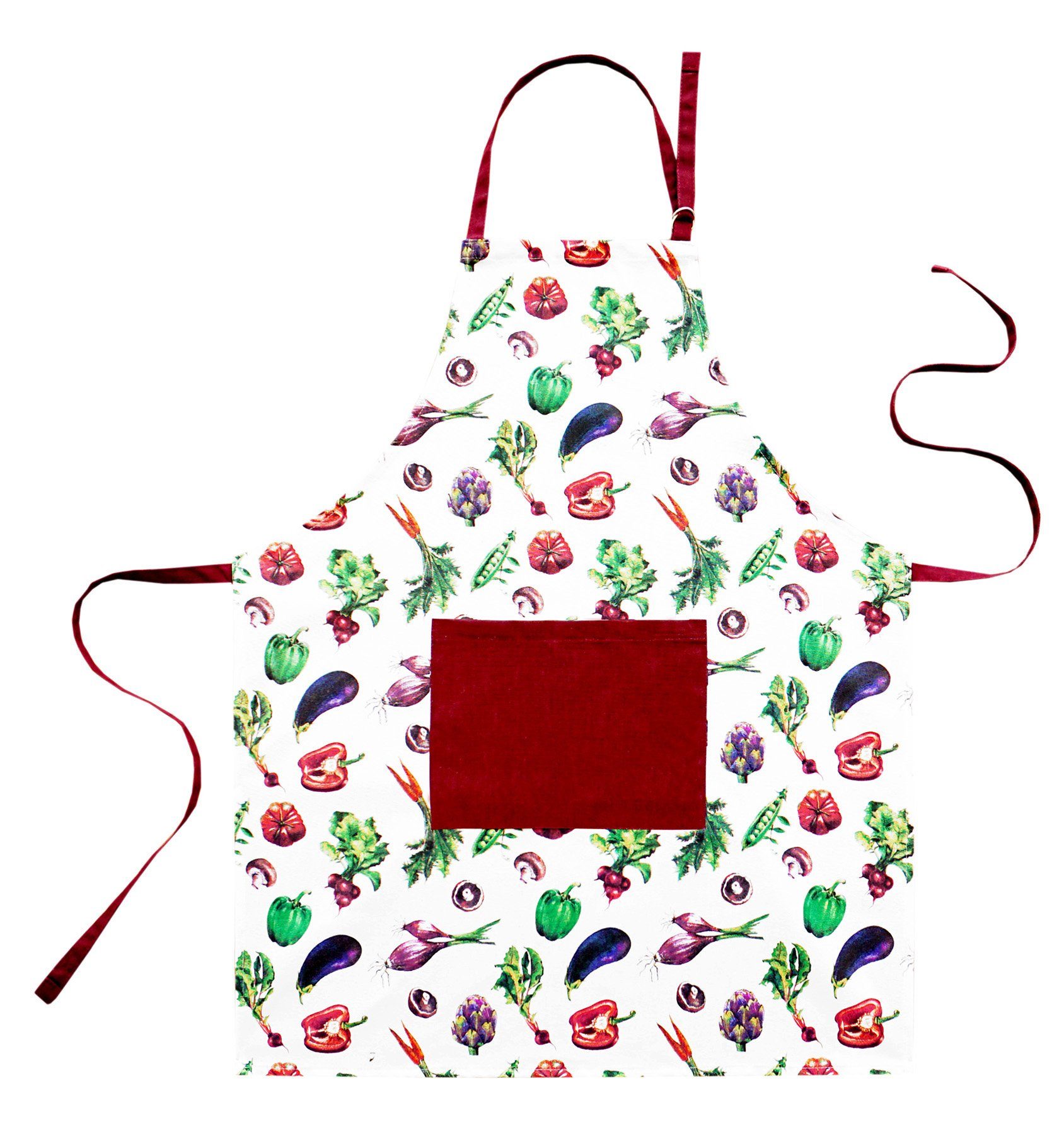 Das Motiv unserer Baumwollschürze haben Sie zum Essen gern! Leckeres Gemüse in kräftigen Farben auf der Arbeitsschürze machen Lust auf Kochen.